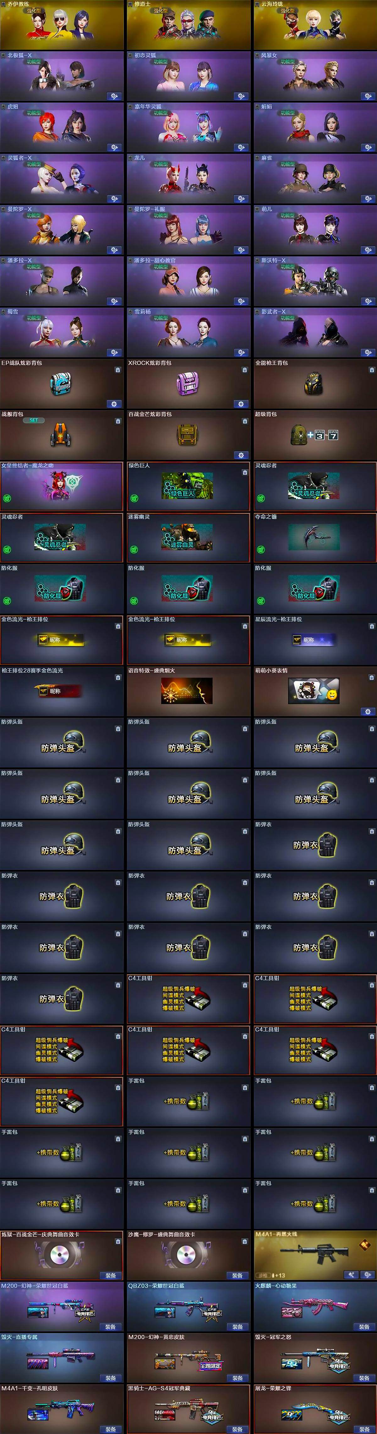 - [14861753]上海一区-47V-7王者-3炫金 【热门武器】:QBZ03-金色蔷薇,HK417-朱雀,柯尔特-冠军之特,M4A1-黑骑士,沙鹰-修罗*3 【王者炫金武器】:炫金无影,炫金千变,炫金毁灭,王者之魄高爆手雷,王者之魄闪光弹 【音效卡】:屠龙-云海游龙音效卡,M4A1-黑骑士音效卡 【皮肤】:幻神-降龙,雷神-虎将,雷神-耀金皮肤,火麒麟-轻羽皮肤,毁灭-荣耀之怒,毁灭-黑大圣皮肤,毁灭-英雄计划 皮肤,黑骑士-少林,HK417-朱雀-武当,屠龙-荣耀之锋 【角色】:隼,王者-零-国色天香,堕落女神,潘多拉-甜心教官 【人偶武器】:巴雷特-零-水下丽影,Scar Light-马枪,跳跳鲨,USP-铃狮送福,COP-旗袍 【英雄级武器】:AK47-火麒麟,M4A1-雷神,M4A1-黑骑士,M4A1-死神,HK417-朱雀,M4A1-神工天巧,M4A1-玫瑰精灵,QBZ03-金色蔷薇,王者之武-觉醒版,王者风势-觉醒版,AWM-天龙,Barrett-毁灭,Barrett-极光,王者风神-觉醒版,沙鹰-修罗*3,沙鹰-天神,柯尔特-冠军之特,USP-神工天巧*2,屠龙*2,龙啸,擎天,麒麟刺,唐刀-神工天巧,高爆手雷-神工天巧*7,闪光弹-神工天巧*7,烟雾弹-神工天巧*8 【道具】:战舰背包,绿色巨人,夺命之镰,防化服*2,金色流光-枪王排位,枪王排位29赛季金色流光,防弹头盔*2,防弹衣*2,C4工具钳*2,手雷包*2 【特殊枪械】:1黑骑士
