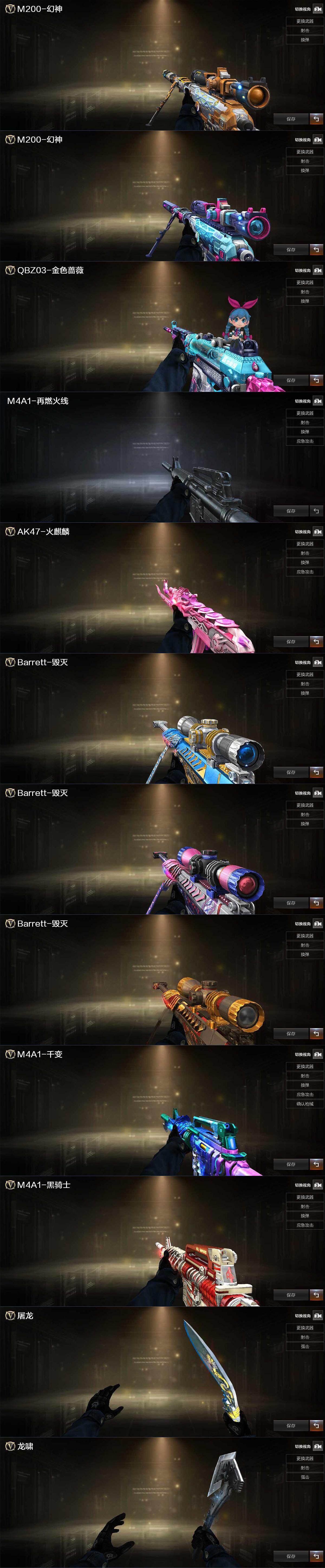 【皮肤】:M200-幻神-黄忠皮肤,M200-幻神-荣耀世冠白鲨,幻神-电竞之星 皮肤,QBZ03-荣耀世冠白鲨,M4A1-再燃火线,火麒麟-心动糖果,毁灭-冠军之怒,毁灭-英雄计划 皮肤,M4A1-千变-孔明皮肤,黑骑士-AG-S4冠军典藏,屠龙-荣耀之锋,轻型军用手斧-再燃火线
