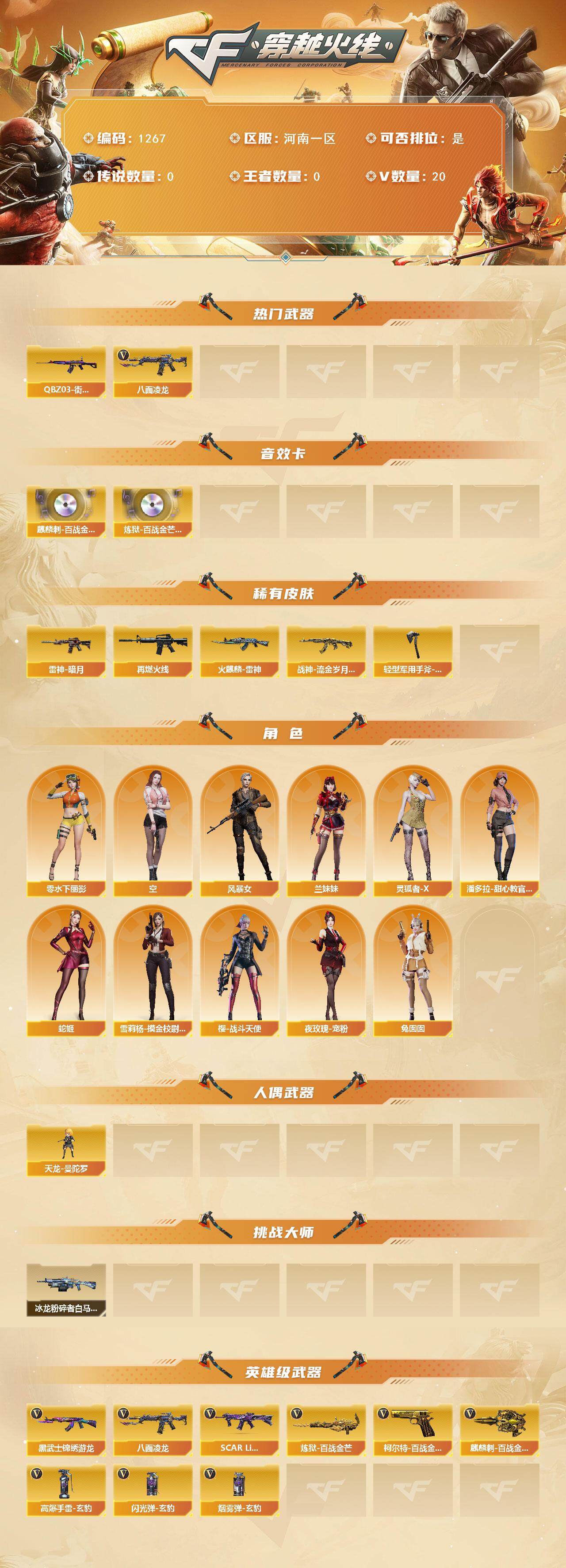 [15092582]河南一区-20V-0王者-0炫金 【热门武器】:八面凌龙,QBZ03-街机 【音效卡】:麒麟刺-百战金芒-盛典舞曲音效卡,炼狱-百战金芒-庆典舞曲音效卡 【皮肤】:雷神-暗月,M4A1-再燃火线,火麒麟-雷神,战神-流金岁月皮肤,轻型军用手斧-再燃火线 【角色】:空,风暴女,兰妹妹,零-水下丽影,灵狐者-X,潘多拉-甜心教官,蛇姬,兔囡囡,雪莉杨-摸金校尉,夜玫瑰-宠粉,樱-战斗天使 【人偶武器】:天龙-曼陀罗 【挑战大师】:冰龙粉碎者-白马银枪 【英雄级武器】:黑武士-锦绣游龙,八面凌龙,SCAR Light-玄豹,炼狱-百战金芒,Anaconda-玄豹,柯尔特-百战金芒,麒麟刺-百战金芒,高爆手雷-玄豹*2,闪光弹-玄豹,烟雾弹-玄豹*3 【道具】:CFS限定背包,亚洲杯纪念炫彩背包,冰冰企鹅背包,女皇终结者-背包,牛魔王背包-至尊黄金,百战金芒炫彩背包,女皇终结者-魔龙之吻,绿色巨人,灵魂忍者,迷雾幽灵,夺命之镰,防化服*3,金色流光-枪王排位,星辰流光-枪王排位,枪王排位28赛季金色流光,枪王排位29赛季金色流光,语音特效-盛典烟火,萌萌小葵表情,EP战队名片,EP战队喷图,C4-红龙,防弹头盔*4,防弹衣*4,C4工具钳*4,手雷包*4 【特殊枪械】: