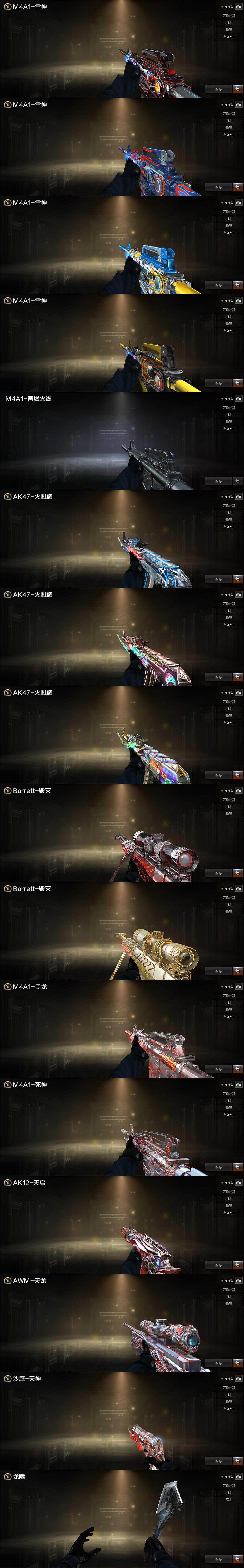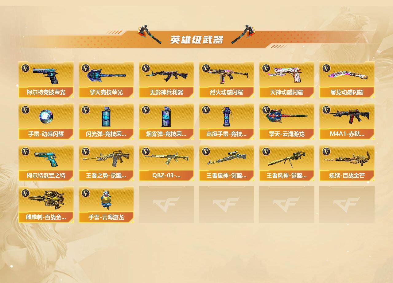 【英雄级武器】:AK47-火麒麟,M4A1-雷神,M4A1-死神*3,无影-神兵利器,烈火-动感闪耀,王者之势-觉醒版,QBZ-03-王者蔷薇-觉醒版,AWM-天龙,Barrett-毁灭*2,Barrett-极光,王者星神-觉醒版,王者风神-觉醒版,炼狱-百战金芒,汤姆逊-烈龙*3,沙鹰-修罗*6,柯尔特-冠军之特,柯尔特-竞技荣光,天神-动感闪耀,屠龙*3,龙啸,擎天,麒麟刺,擎天-竞技荣光,屠龙-动感闪耀*2,擎天-云海游龙,麒麟刺-百战金芒,高爆手雷-竞技荣光*2,手雷-动感闪耀,手雷-云海游龙,闪光弹-竞技荣光*2,烟雾弹-竞技荣光*2,M4A1-赤狱骑士