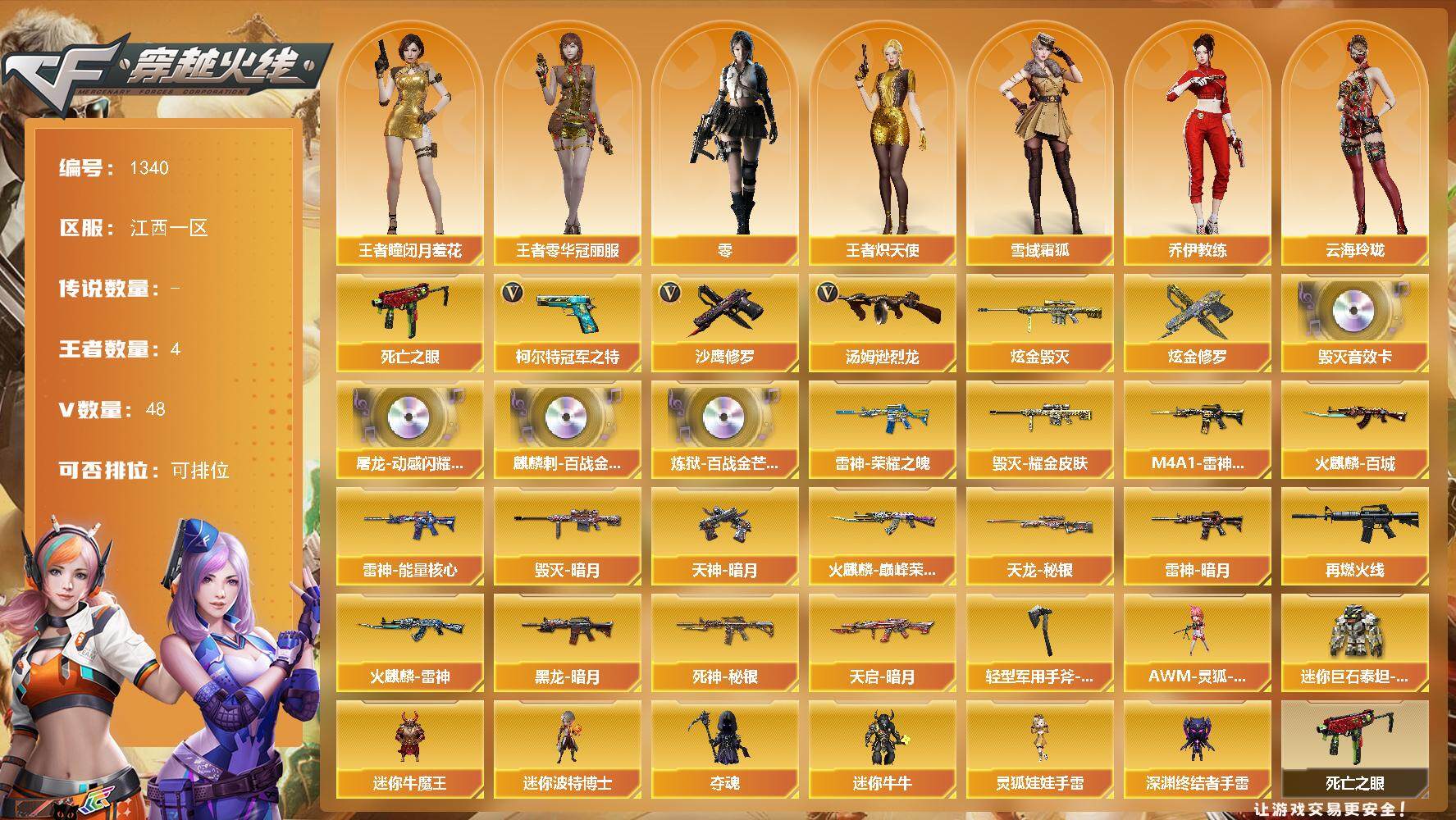 [15234193]江西一区-48V-4王者-2炫金 【传说角色】:传说艾莉莎 【热门武器】:死亡之眼,柯尔特-冠军之特,汤姆逊-烈龙*3,沙鹰-修罗*6 【王者炫金武器】:炫金毁灭,炫金修罗 【音效卡】:屠龙-动感闪耀 音效卡,Barrett-毁灭音效卡,麒麟刺-百战金芒-盛典舞曲音效卡,炼狱-百战金芒-庆典舞曲音效卡 【皮肤】:雷神-暗月,雷神-能量核心,雷神-荣耀之魄,M4A1-雷神-CFS 2019,M4A1-再燃火线,火麒麟-雷神,火麒麟-百城,火麒麟-巅峰荣耀,毁灭-暗月*3,毁灭耀金皮肤,黑龙-暗月,死神-秘银*3,天启-暗月,天龙-秘银,天神-暗月*3,轻型军用手斧-再燃火线 【角色】:零,王者-瞳-闭月羞花,王者零-华冠丽服,王者炽天使,雪域霜狐,奇洋探员,乔伊教练,云海玲珑,暗夜-X,初恋灵狐,芳心审判者,嘉年华灵狐,灵狐者-七夕宝贝,麻雀,潘多拉-X,潘多拉-甜心教官,斯沃特-X,新娜塔莎,影武者-X 【人偶武器】:AWM-灵狐-15周年嘉年华*2,迷你牛魔王,迷你波特博士,夺魂*2,迷你牛牛,深渊终结者手雷,迷你巨石泰坦-魔花研究所,灵狐娃娃手雷 【暴走生化】:死亡之眼 【挑战大师】:冰龙粉碎者-白马银枪,激光毁灭者III-白马银枪,激光毁灭者III,神圣爆裂者-末日III 【英雄级武器】:AK47-火麒麟,M4A1-雷神,M4A1-死神*3,无影-神兵利器,烈火-动感闪耀,王者之势-觉醒版,QBZ-03-王者蔷薇-觉醒版,AWM-天龙,Barrett-毁灭*2,Barrett-极光,王者星神-觉醒版,王者风神-觉醒版,炼狱-百战金芒,汤姆逊-烈龙*3,沙鹰-修罗*6,柯尔特-冠军之特,柯尔特-竞技荣光,天神-动感闪耀,屠龙*3,龙啸,擎天,麒麟刺,擎天-竞技荣光,屠龙-动感闪耀*2,擎天-云海游龙,麒麟刺-百战金芒,高爆手雷-竞技荣光*2,手雷-动感闪耀,手雷-云海游龙,闪光弹-竞技荣光*2,烟雾弹-竞技荣光*2,M4A1-赤狱骑士 【道具】:BS战队炫彩背包,云山科技背包,全能枪王背包,战舰背包,炫彩背包,百战金芒炫彩背包,超级背包,雪域霜狐炫彩背包,女皇终结者-魔龙之吻,救世主-黑桃战神,黄金生化钩,绿色巨人,灵魂忍者,变异宝贝,妖姬,迷雾幽灵,夺命之镰,防化服*3,金色流光-枪王排位*2,流光-鎏金之域,流光-再燃火线,枪王排位29赛季金色流光,语音特