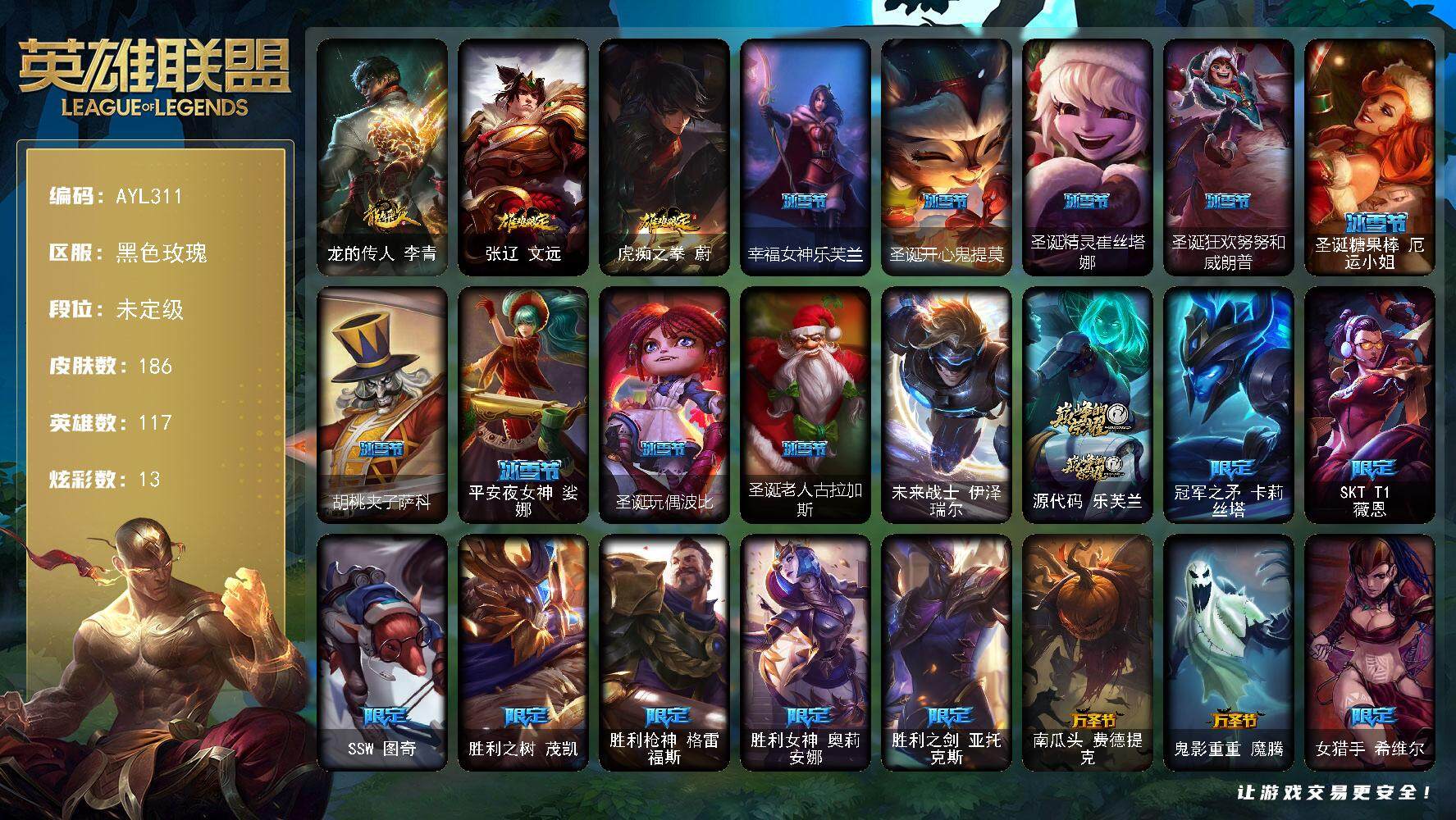[15393053]【特价出售/店主推荐】 未定级段位-117英雄-186皮肤-13炫彩-1终极-1神话-25限定-18传说-52史诗 【臻彩皮肤】:霸天巨兽雪崩墨菲特,红莲之刃锐雯 【年限皮肤】:龙的传人李青,张辽文远,虎痴之拳蔚 【冰雪限定】:幸福女神乐芙兰,圣诞开心鬼提莫,圣诞精灵崔丝塔娜,圣诞狂欢努努和威朗普,圣诞糖果棒厄运小姐,胡桃夹子萨科,平安夜女神娑娜,圣诞玩偶波比,圣诞老人古拉加斯 【终极皮肤】:未来战士伊泽瑞尔 【神话皮肤】:源代码乐芙兰 【限定皮肤】:冠军之矛卡莉丝塔,SKTT1薇恩,SSW图奇,胜利之树茂凯,胜利枪神格雷福斯,胜利女神奥莉安娜,胜利之剑亚托克斯,南瓜头费德提克,鬼影重重魔腾,女猎手希维尔,防暴士兵辛吉德,防暴天使凯尔,警用试作体K9内瑟斯 【传说皮肤】:战地机甲厄加特,大天使长米迦勒凯尔,钢铁之翼凯尔,源计划林易,烈焰雄心崔丝塔娜,驯龙炮手崔丝塔娜,源计划联合艾希,冰霜之刃艾瑞莉娅,红色男爵库奇,银河魔装机神兰博,第三类接触黑默丁格,钢铁军团盖伦,星之守护者拉克丝,冰霜亚龙希瓦娜,苍穹之光韦鲁斯,宇航员诺提勒斯,泳池派对吉格斯,灌篮高手德莱厄斯 【史诗皮肤】:冰霜烈焰安妮,科学怪熊的新娘安妮,翼骑统领赵信,铁钩船长费德提克,地狱火阿利斯塔,月光女神阿忒弥斯索拉卡,熊猫提莫,火箭达人崔丝塔娜,女船长厄运小姐,紫晶射手艾希,黑色荆棘莫甘娜,熔火之心拉莫斯,寒冰女皇迦娜,穿着正装的恶魔维迦,霸天巨兽墨菲特,无畏号墨菲特,海贼魅影卡特琳娜,暗夜猫女卡特琳娜,源计划雄心卡特琳娜,V字仇杀者布兰德,防弹武僧李青,至高之拳李青,苍穹之光薇恩,血色之锤波比,星之守护者波比,大夏武士潘森,冰川勇者伊泽瑞尔,死亡领主莫德凯撒,实习护士阿卡丽,铁血女忍阿卡丽,铁甲雄心盖伦,钢铁烈阳蕾欧娜,源计划山蕾欧娜,刺客信条锐雯,血色精锐锐雯,兔女郎锐雯,星际迷航拉克丝,沙之守护泽拉斯,银河魔装机神希瓦娜,暗黑武士雷恩加尔,白色死神韦鲁斯,暗星韦鲁斯,星之守护者璐璐,铁血帝皇德莱厄斯,生化骑士德莱厄斯,仲裁圣女辛德拉,邪恶魔人扎克,西部牛仔亚索,源计划风亚索,源代码卡蜜尔,源计划自由艾克,霓虹杀拳蔚 【王者皮肤】:五杀摇滚鼓手奥拉夫,孤胆英豪嘉文四世 【勇士皮肤】:拆弹专家黑默丁格,冰河时代奥拉夫,亮丽女神希维尔 【其他皮肤1】:幽蓝梦魇加里奥,皇家守卫赵信,电锯狂人厄加特,钢铁