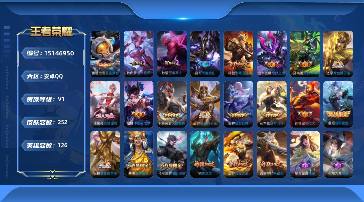 - [12258146]V7 2典藏 1珍品传说 19传说 124英雄 312皮肤 可修改实名 优质装备:全息碎影(猴子典藏),九霄神辉(木兰典藏),怪盗基德,黄金狮子座,冠军飞将,炽阳神光,一念神魔,地狱火,地狱之眼,游龙清影(小青龙),鹤归松栖(云缨),琥珀纪元马超,千山共赴,涂山容容 传说皮:乘龙·问璇玑(孙尚香年限),幻光神枪 珍宝阁皮:妄想食味,优雅恋人 限定皮:愿照·山河定(司空震年限),逐霄战戟,陌上桑,鸣野蒿,白虎志(电光耗子),飞衡(韩信年限),瑞麟志(木兰年限),至美·乘鲤谣,遇见飞天,五谷丰年,青龙志(铠年限),武圣,游园惊梦,梁祝,李小龙,逐梦之影,默契交锋-兰陵王,大圣娶亲,引擎之心,启示之音,时之奇旅-妲己,山海·玄木吟(马可年限) 史诗皮:龙之律动,破空之剑,战舞者,蒙犽顽岩魄,芈月浮光幕影,蔬乡物语(鲁班七号),百相守梦-百里守约,电玩小子(小书包),白龙吟,黄金分割率,特工魅影,千年之狐,江河有灵,鹤归松栖(赵怀真),真我赫兹(镜),魅语,高渐离燃音魔法,蒙恬荣光圣徽,无限星赏官,冰冠公主,偶像歌手,末日机甲-吕布,猫狗日记-孙策,修罗,女仆咖啡,摇滚巨星,水果甜心,天才门将,星夜王子,心灵骇客,德古拉伯爵,暗隐猎兽者,幽灵船长,鬼剑武藏,心灵战警,舞动绿茵,地狱岩魂,诗语江南,繁星吟游(呼啦呼啦),拒霜思,缤纷独角兽,乘风破浪,逐浪之夏,水晶猎龙者,曙光守护者,热力回旋,金属风暴,原初追逐者,圣诞狂欢,圣诞恋歌,鹰眼统帅,王者之锤,暗夜贵公子,黎明之约,滕王阁序
