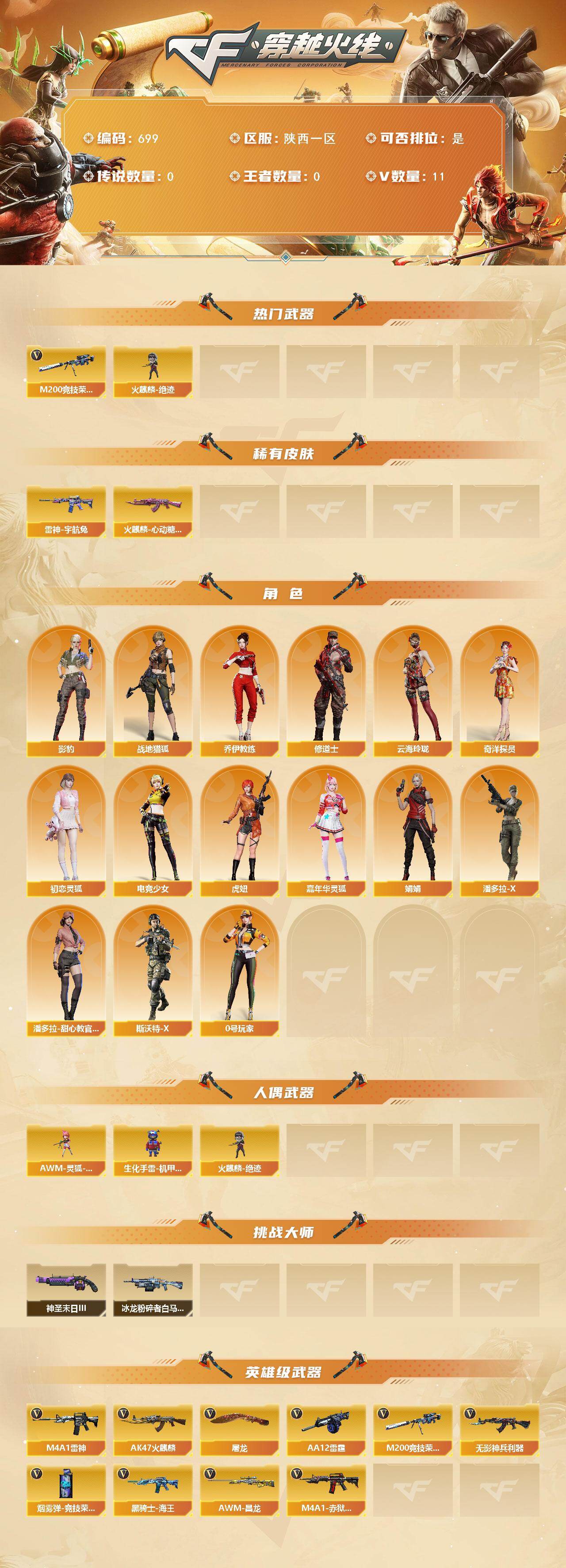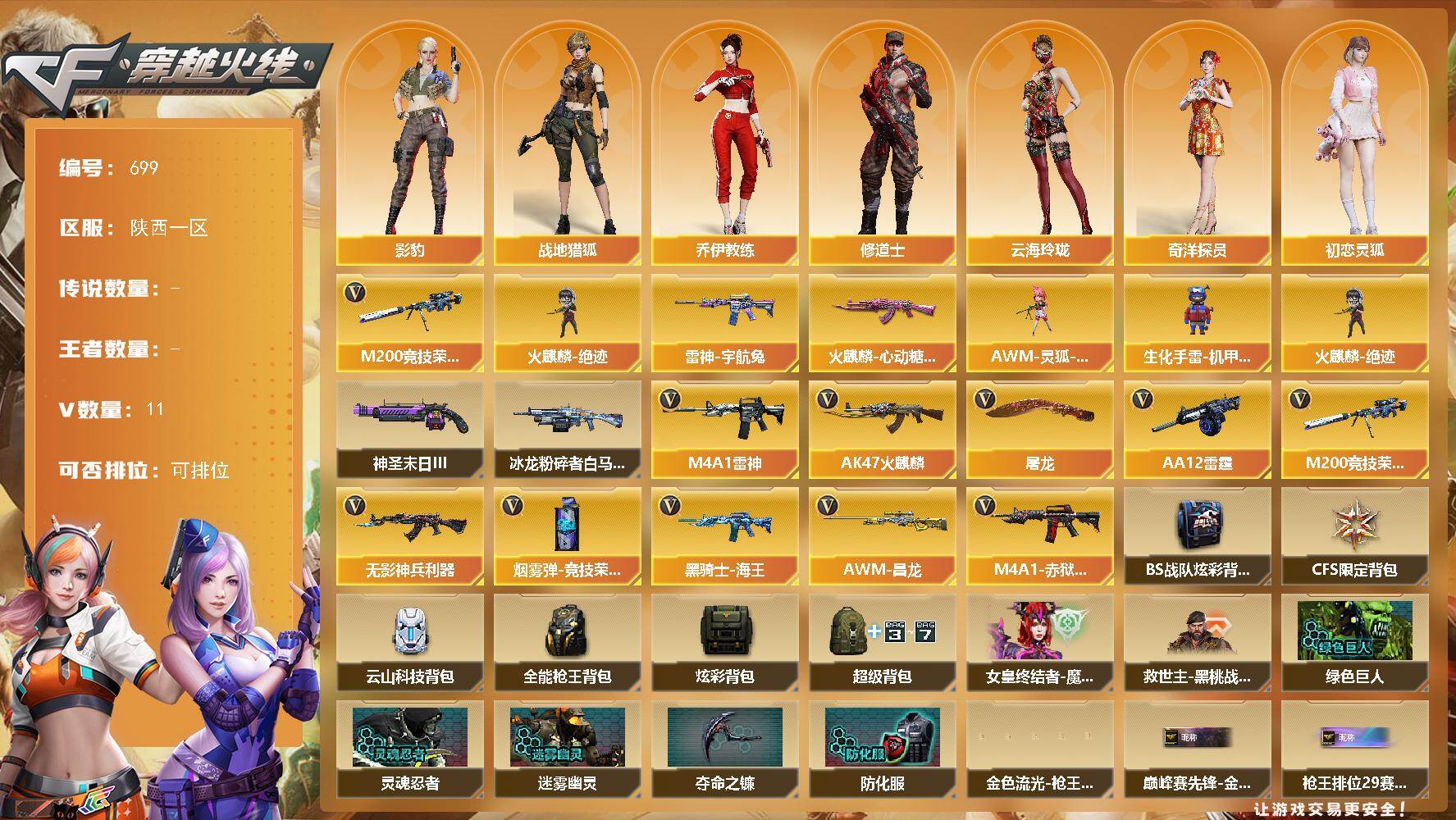[15385357]陕西一区-11V-0王者-0炫金 【热门武器】:M200-竞技荣光,火麒麟-绝迹 【皮肤】:雷神-宇航兔皮肤,火麒麟-心动糖果 【角色】:影豹,战地猎狐,奇洋探员,乔伊教练,修道士,云海玲珑,初恋灵狐,电竞少女,虎妞,嘉年华灵狐,娟娟,0号玩家,潘多拉-X,潘多拉-甜心教官,斯沃特-X 【人偶武器】:火麒麟-绝迹,AWM-灵狐-15周年嘉年华,生化手雷-机甲核心 【挑战大师】:冰龙粉碎者-白马银枪,神圣爆裂者-末日III 【英雄级武器】:AK47-火麒麟,M4A1-雷神,无影-神兵利器,黑骑士-海王,M200-竞技荣光,AA-12-雷霆,屠龙,烟雾弹-竞技荣光,M4A1-赤狱骑士,AWM-昌龙 【道具】:BS战队炫彩背包,CFS限定背包,云山科技背包,全能枪王背包,炫彩背包,超级背包,女皇终结者-魔龙之吻,救世主-黑桃战神,绿色巨人,灵魂忍者,迷雾幽灵,夺命之镰,防化服*3,金色流光-枪王排位*2,星辰流光-枪王排位,巅峰赛先锋-金色流光,枪王排位28赛季金色流光,枪王排位29赛季金色流光,EP战队名片,EP战队击杀图标,防弹头盔*3,防弹衣*3,C4工具钳*3,手雷包*3 【特殊枪械】: