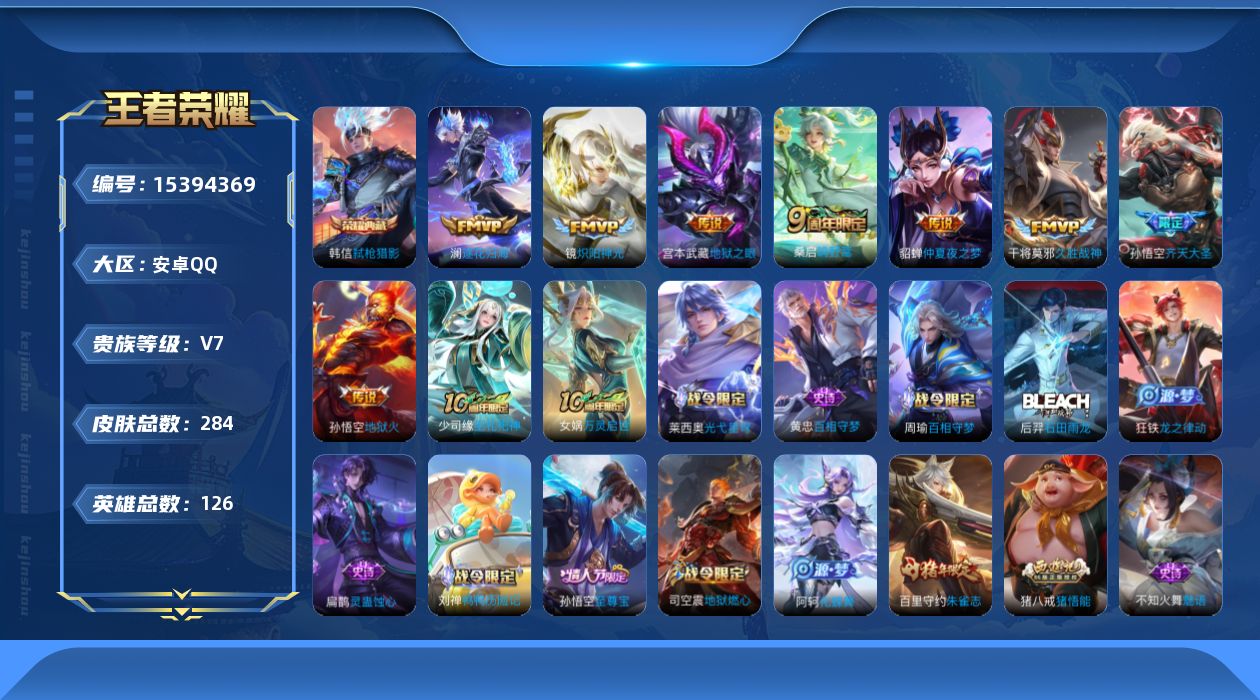 [15394369]可二次【店主推荐捡漏号!可直接换绑】安卓Q-V7-最强王者段位-126英雄-284皮肤-1典藏皮肤-9传说-73史诗-3星传说