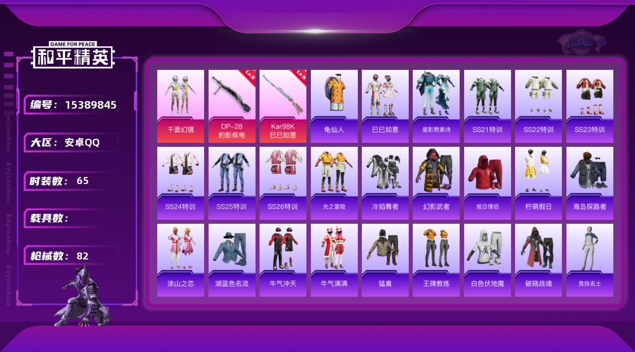 [15389845]【店主推荐捡漏号!可直接换绑】 安卓 手Q-1粉装-2特效枪-1粉色飞行器-2.3w热力值-4王牌印记-65套装-82枪皮【热门品类】:套装-龟仙人【粉色套装】:粉装-千面幻镜【粉色枪皮等级】:Kar98K-巳巳如意(五级),DP-28-豹影疾电(五级)【粉色飞行器】:千面幻镜飞行器