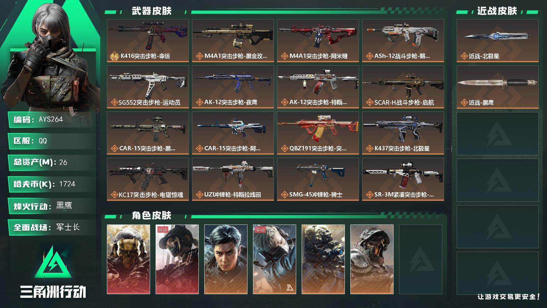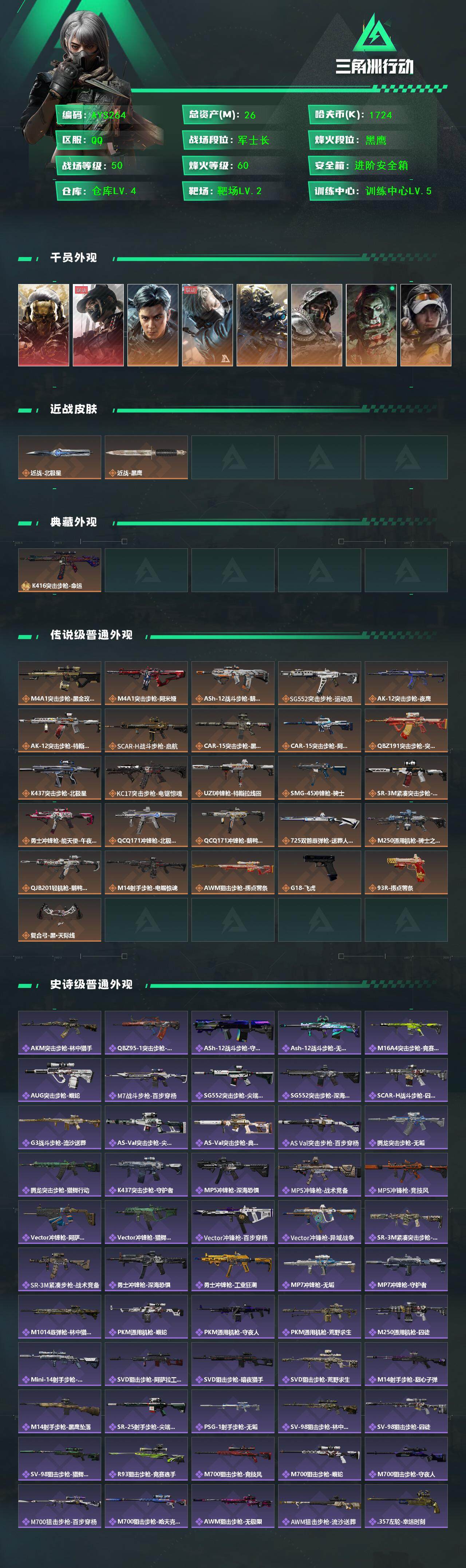 [15405166]26m总资产-1724k哈伏币-60烽火等级-黑鹰-50战场等级-军士长 【干员外观】:红狼-蚀金玫瑰,露娜-黑·天际线,威龙-飞虎,蜂医-送葬人·无题密令,无名-夜鹰,深蓝-不破誓约,红狼-电锯惊魂,露娜-金牌射手 【近战皮肤】:近战-北极星,近战-黑鹰 【典藏外观】:K416突击步枪-命运 【传说外观】:M4A1突击步枪-蚀金玫瑰,M4A1突击步枪-阿米娅,ASh-12战斗步枪-鹅鸭杀,SG552突击步枪-运动员,AK-12突击步枪-夜鹰,AK-12突击步枪-特斯拉线圈,SCAR-H战斗步枪-启航,CAR-15突击步枪-黑鹰坠落,CAR-15突击步枪-阿米娅,腾龙突击步枪-捞点薯条,K437突击步枪-北极星,KC17突击步枪-电锯惊魂,UZI冲锋枪-特斯拉线圈,SMG-45冲锋枪-骑士,SR-3M紧凑突击步枪-特斯拉线圈,勇士冲锋枪-能天使-午夜邮差,QCQ171冲锋枪-北极星,QCQ171冲锋枪-鹅鸭杀,725双管霰弹枪-送葬人-无题密令,M250通用机枪-骑士之心,QJB201轻机枪-鹅鸭杀,M14射手步枪-电锯惊魂,AWM狙击步枪-捞点薯条,G18-飞虎,93R-捞点薯条,复合弓-黑·天际线 【史诗外观】:AKM突击步枪-林中猎手,QBZ95-1突击步枪-曙光,ASh-12战斗步枪-守夜人,ASh-12战斗步枪-无极限,M16A4突击步枪-竞赛选手,AUG突击步枪-蝮蛇,M7战斗步枪-百步穿杨,SG552突击步枪-尖端治疗,SG552突击步枪-深海恐惧,SCAR-H战斗步枪-囚徒,G3战斗步枪-流沙送葬,AS Val突击步枪-尖端治疗,AS Val突击步枪-典狱官,AS Val突击步枪-百步穿杨,腾龙突击步枪-无垢,腾龙突击步枪-猎鳄行动,K437突击步枪-守护者,MP5冲锋枪-深海恐惧,MP5冲锋枪-战术竞备,MP5冲锋枪-竞技风,Vector冲锋枪-阿萨拉文明,Vector冲锋枪-猎鳄行动,Vector冲锋枪-百步穿杨,Vector冲锋枪-异域战争,SR-3M紧凑突击步枪-荒野求生,SR-3M紧凑突击步枪-战术竞备,勇士冲锋枪-深海恐惧,勇士冲锋枪-工业狂潮,MP7冲锋枪-无垢,MP7冲锋枪-守护者,M1014霰弹枪-林中猎手,PKM通用机枪-蝮蛇,PKM通用机枪-守夜人,PKM通用机枪-荒野求生,M250通用机枪-囚徒,Mini-14射手步枪-守护