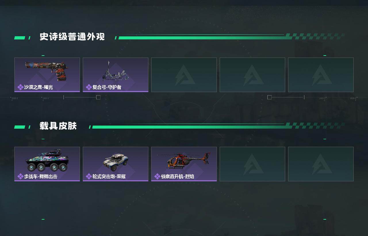 【史诗外观】:AKM突击步枪-林中猎手,QBZ95-1突击步枪-曙光,ASh-12战斗步枪-守夜人,ASh-12战斗步枪-无极限,M16A4突击步枪-竞赛选手,AUG突击步枪-蝮蛇,M7战斗步枪-百步穿杨,SG552突击步枪-尖端治疗,SG552突击步枪-深海恐惧,SCAR-H战斗步枪-囚徒,G3战斗步枪-流沙送葬,AS Val突击步枪-尖端治疗,AS Val突击步枪-典狱官,AS Val突击步枪-百步穿杨,腾龙突击步枪-无垢,腾龙突击步枪-猎鳄行动,K437突击步枪-守护者,MP5冲锋枪-深海恐惧,MP5冲锋枪-战术竞备,MP5冲锋枪-竞技风,Vector冲锋枪-阿萨拉文明,Vector冲锋枪-猎鳄行动,Vector冲锋枪-百步穿杨,Vector冲锋枪-异域战争,SR-3M紧凑突击步枪-荒野求生,SR-3M紧凑突击步枪-战术竞备,勇士冲锋枪-深海恐惧,勇士冲锋枪-工业狂潮,MP7冲锋枪-无垢,MP7冲锋枪-守护者,M1014霰弹枪-林中猎手,PKM通用机枪-蝮蛇,PKM通用机枪-守夜人,PKM通用机枪-荒野求生,M250通用机枪-囚徒,Mini-14射手步枪-守护