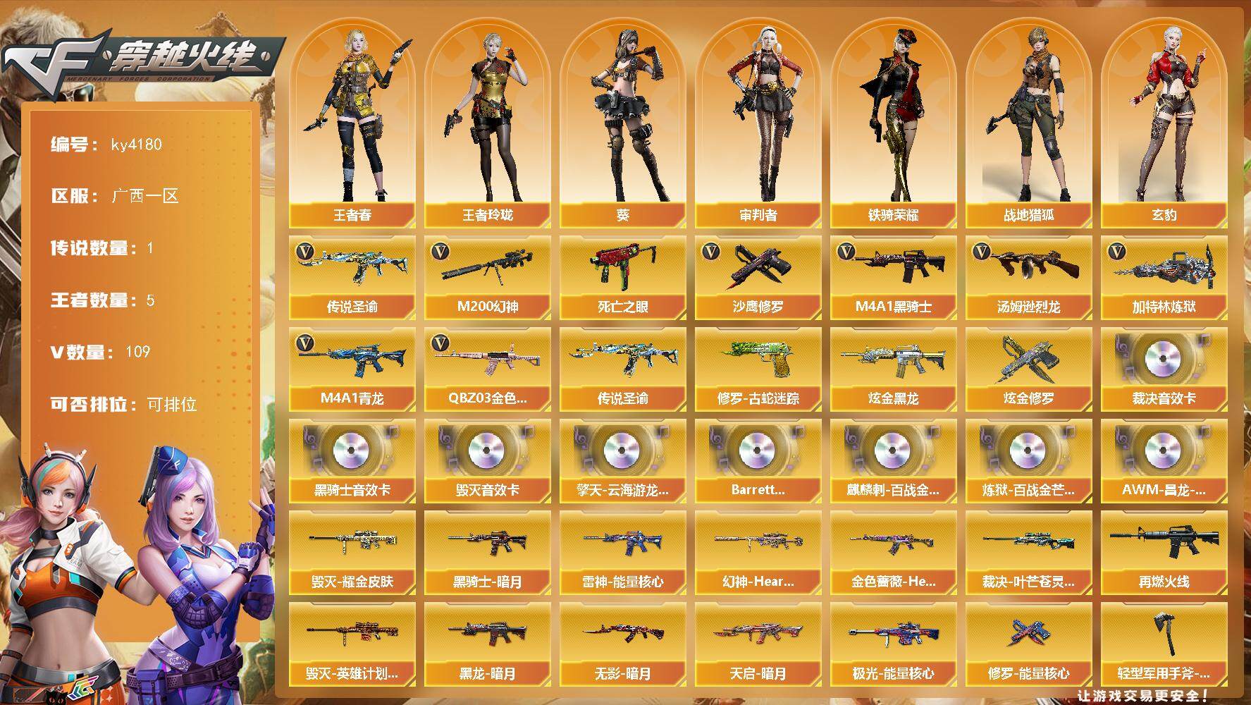 [15246272]广西一区-109V-5王者-2炫金 【传说武器】:传说圣谕 【热门武器】:传说圣谕,QBZ03-金色蔷薇,M4A1-青龙,M200-幻神,修罗-古蛇迷踪,死亡之眼*2,M4A1-黑骑士*2,汤姆逊-烈龙*6,加特林-炼狱,沙鹰-修罗*4 【王者炫金武器】:炫金黑龙,炫金修罗 【音效卡】:擎天-云海游龙音效卡,M4A1-黑骑士音效卡,Barrett-毁灭音效卡,AWM-裁决音效卡,Barrett-碧霄极光音效卡,麒麟刺-百战金芒-盛典舞曲音效卡,炼狱-百战金芒-庆典舞曲音效卡,AWM-昌龙-怀旧音效卡 【皮肤】:幻神-Heartshot 皮肤,金色蔷薇-Heartshot皮肤,裁决-叶芒苍灵 皮肤,雷神-能量核心,M4A1-再燃火线,毁灭耀金皮肤,毁灭-英雄计划 皮肤,黑龙-暗月,黑骑士-暗月*2,无影-暗月,天启-暗月*2,极光-能量核心*2,修罗-能量核心*2,轻型军用手斧-再燃火线 【角色】:葵,玄豹,审判者,战地猎狐,王者春,王者玲珑,蛇隐宗,奇洋探员,乔伊教练,修道士,云海玲珑,暗夜-X,风暴女,嘉年华灵狐,兰-海滩派对,兰妹妹,潘多拉-甜心教官,蛇姬,铁骑荣耀,兔囡囡,新娜塔莎,雪莉杨-摸金校尉,影武者-X 【人偶武器】:异变清道夫-蛇影双骄,生化手雷-机甲核心 【暴走生化】:死亡之眼*2 【挑战大师】:激光毁灭者III-白马银枪,激光毁灭者III 【英雄级武器】:AK47-火麒麟,M4A1-黑龙,M4A1-雷神*2,M4A1-黑骑士*2,AK47-黑武士,AK12-天启,M4A1-武圣,AK47-黑鲨,M4A1-青龙,M4A1-幻灵,SCAR Light-玄豹,QBZ03-独角-III,M4A1-玫瑰精灵,QBZ03-金色蔷薇,AWM-天龙*2,Barrett-毁灭,Barrett-极光*4,AWM-裁决,M200-幻神,Barrett-金色蔷薇*2,加特林-炼狱,炼狱-百战金芒,炼狱-悦蓝-觉醒版,汤姆逊-烈龙*6,AA-12-雷霆,沙鹰-修罗*4,沙鹰-天神,柯尔特-竞技荣光,柯尔特-荣耀世冠EP,Anaconda-玄豹,Glock18-武圣,修罗-古蛇迷踪,屠龙*2,龙啸,擎天,麒麟刺*3,麒麟刺-百战金芒,丛林匕首-玄豹*2,王者冰锋-觉醒版,高爆手雷-幻灵*2,高爆手雷-竞技荣光*3,高爆手雷-古蛇迷踪,高爆手雷-玄豹*11,闪光弹-幻灵,闪