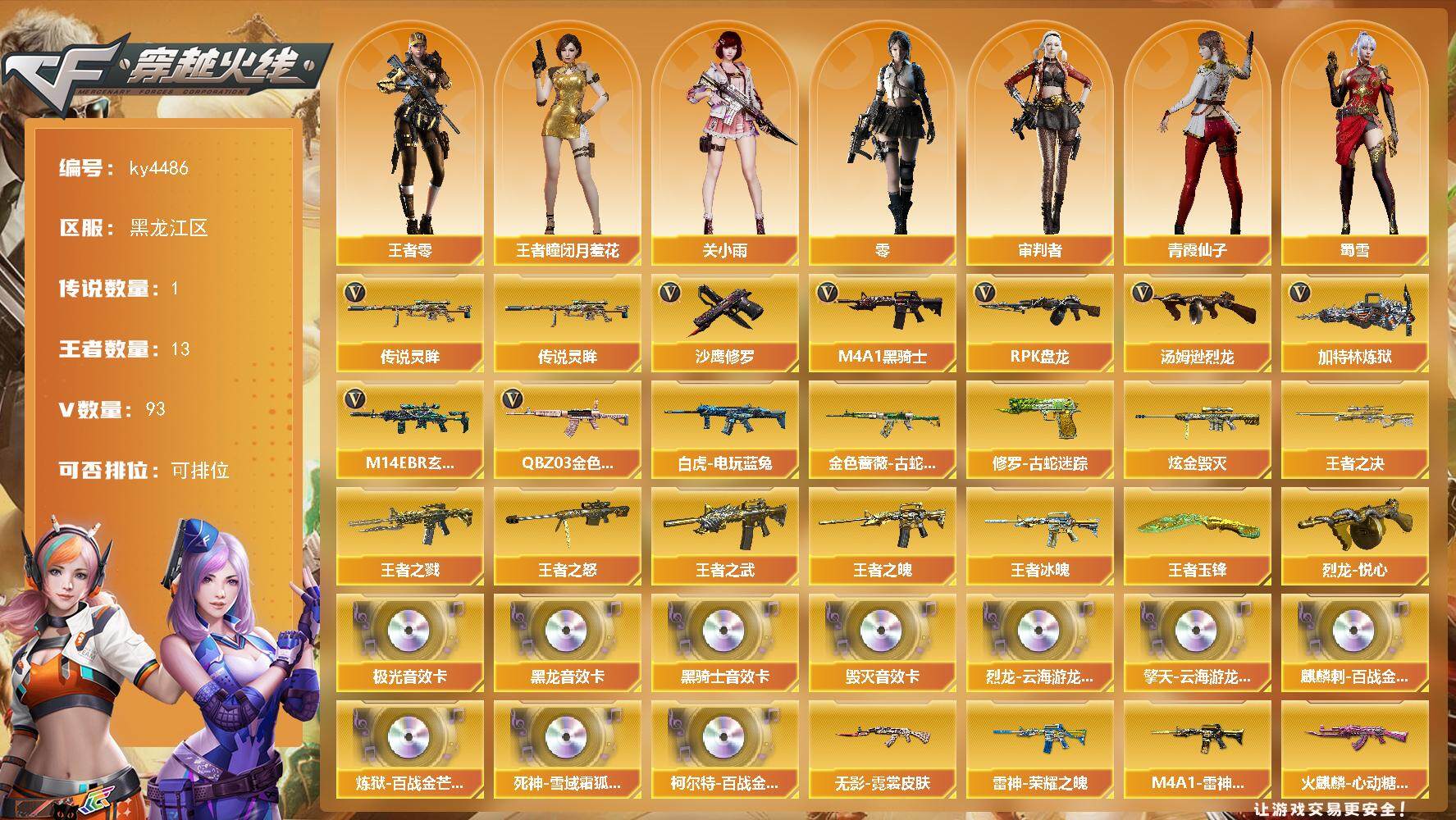 [15248524]黑龙江区-93V-13王者-1炫金 【传说武器】:传说灵眸 【热门武器】:传说灵眸,QBZ03-金色蔷薇,M14EBR-玄武,金色蔷薇-古蛇迷踪,修罗-古蛇迷踪,白虎-电玩蓝兔,M4A1-黑骑士*2,汤姆逊-烈龙,RPK-盘龙,加特林-炼狱*4,沙鹰-修罗*5 【王者炫金武器】:王者冰魄,王者之戮*2,王者之武,王者之魄,王者之决,王者之怒,烈龙-悦心,王者玉锋,炫金毁灭 【音效卡】:烈龙-云海游龙音效卡,擎天-云海游龙音效卡,M4A1-黑龙音效卡,M4A1-黑骑士音效卡,Barrett-毁灭音效卡,Barrett-极光音效卡,麒麟刺-百战金芒-盛典舞曲音效卡,炼狱-百战金芒-庆典舞曲音效卡,死神-雪域霜狐-怀旧音效卡,柯尔特-百战金芒-庆典舞曲音效卡 【皮肤】:金色蔷薇-电竞之星 皮肤,雷神-暗月,雷神-荣耀之魄,M4A1-雷神-CFS 2019,雷神-源计划2.0专属 皮肤,M4A1-再燃火线,雷神-神秘按键 皮肤,火麒麟-心动糖果,毁灭-黑曼巴 皮肤,毁灭-英雄计划 皮肤,黑龙-能量核心,无影-暗月*5,无影-霓裳皮肤,天龙-能量核心,极光-能量核心*2,修罗-能量核心*2,屠龙-春桃 皮肤,屠龙-惊鸿 皮肤,龙啸-纸灯龙皮肤,龙啸-醒狮 皮肤,龙啸-蛇姬 皮肤,轻型军用手斧-再燃火线,麒麟刺-萌杀皮肤 【角色】:零,关小雨,审判者,王者-瞳-闭月羞花,王者-零,雪域霜狐,蛇隐宗,奇洋探员,乔伊教练,修道士,云海玲珑,暗夜-X,北极狐-X,初恋灵狐,电竞少女,芳心审判者,飞虎队-X,风暴女,虎妞,嘉年华灵狐,疾风,娟娟,兰-空鹰,兰-新年限定,兰妹妹,猎狐者-追月,0号玩家,灵狐-花神,灵狐者-X,灵狐者-七夕宝贝,龙儿,龙儿-小淘气,麻雀,曼陀罗-X,曼陀罗-礼服,玫瑰花神,萌儿,娜塔莉娅,潘多拉-X,潘多拉-甜心教官,潜龙队-X,青霞仙子,赛斯-X,蛇姬,斯沃特-X,蜀雪,铁骑荣耀,兔囡囡,维纳斯,新娜塔莎,雪莉杨-摸金校尉,夜玫瑰-幻能朋克,夜玫瑰-宠粉,樱-战斗天使,影武者-X,游珑儿,智影 【人偶武器】:Barrett-云海玲珑,AWM-灵狐-15周年嘉年华*2,迷你波特博士,夺魂*2,生化手雷-机甲核心,深渊终结者手雷*2,迷你巨石泰坦-魔花研究所 【挑战大师】:AK47-冰龙粉碎者,冰龙粉碎者-白马银枪,激光毁灭者III-白马银枪*2 【英雄级