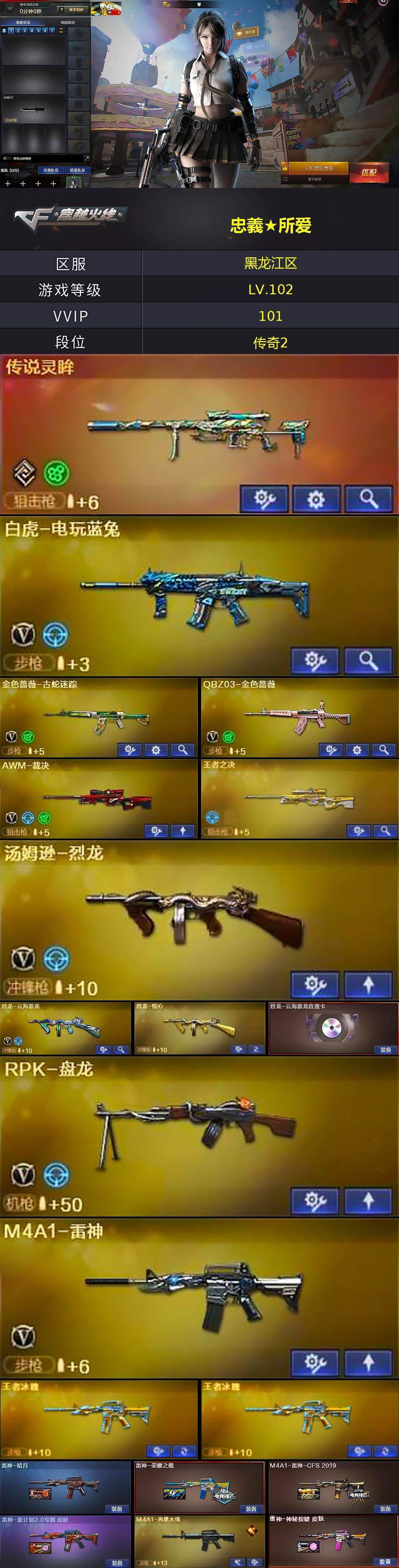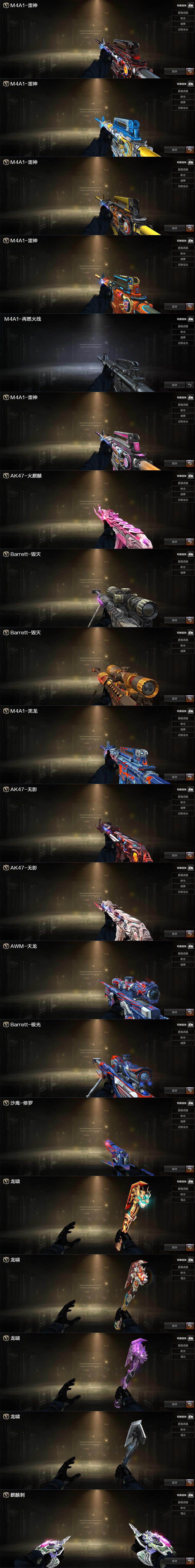 【热门武器】:传说灵眸,QBZ03-金色蔷薇,M14EBR-玄武,金色蔷薇-古蛇迷踪,修罗-古蛇迷踪,白虎-电玩蓝兔,M4A1-黑骑士*2,汤姆逊-烈龙,RPK-盘龙,加特林-炼狱*4,沙鹰-修罗*5
