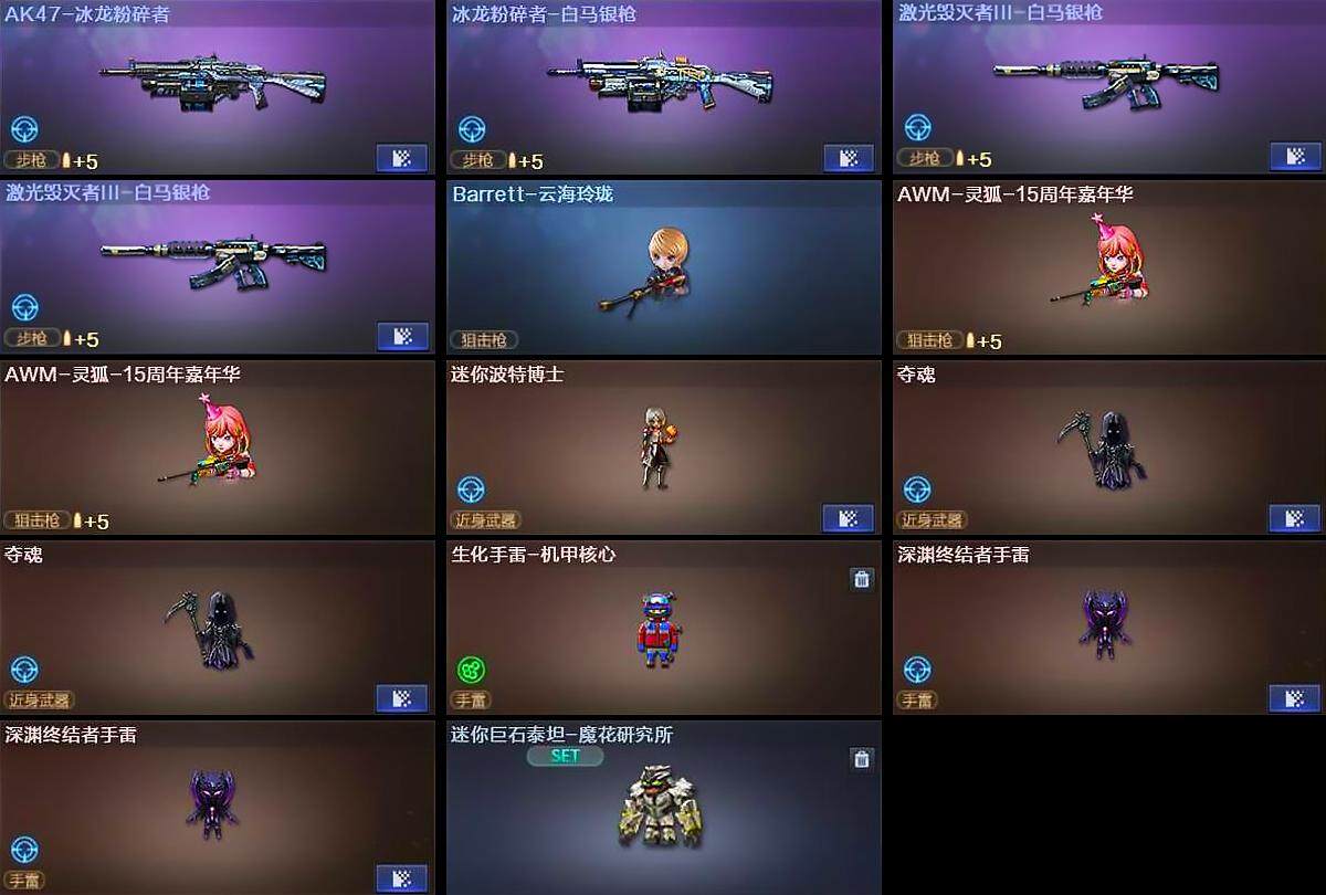 【人偶武器】:Barrett-云海玲珑,AWM-灵狐-15周年嘉年华*2,迷你波特博士,夺魂*2,生化手雷-机甲核心,深渊终结者手雷*2,迷你巨石泰坦-魔花研究所