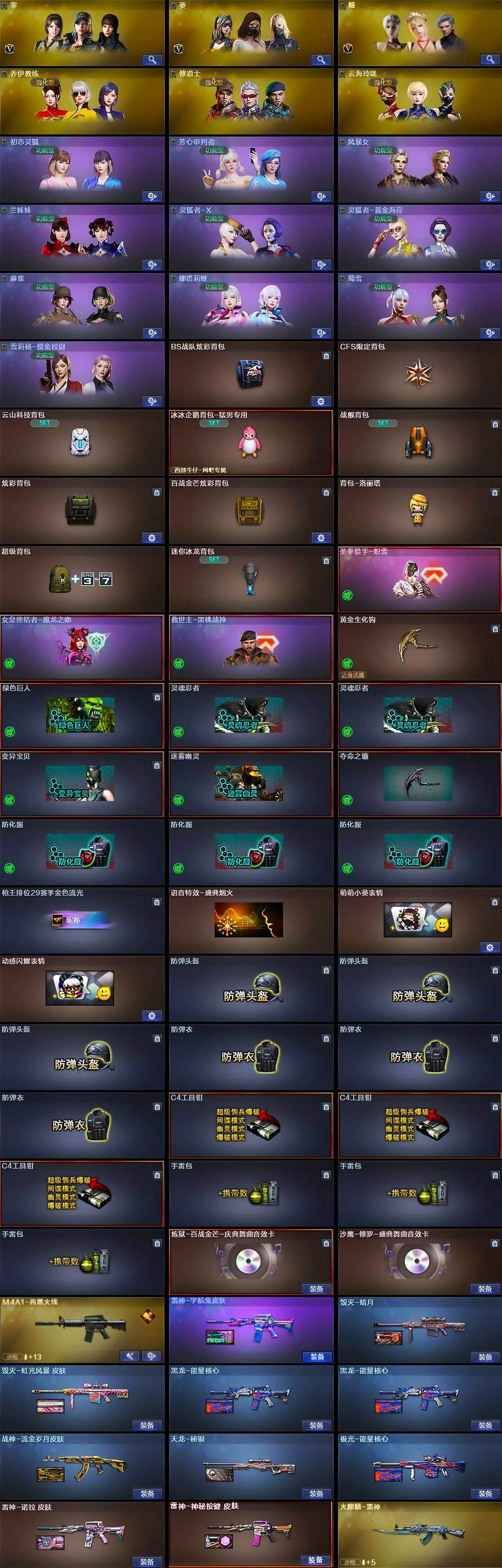 【道具】:BS战队炫彩背包,CFS限定背包,云山科技背包,冰冰企鹅背包-猛男专用,战舰背包,炫彩背包,百战金芒炫彩背包,背包-洛丽塔,超级背包,迷你冰龙背包,圣拳猎手-炽雪,女皇终结者-魔龙之吻,救世主-黑桃战神,黄金生化钩,绿色巨人,灵魂忍者*2,变异宝贝,迷雾幽灵,夺命之镰,防化服*3,枪王排位29赛季金色流光,语音特效-盛典烟火,萌萌小葵表情,动感闪耀表情,防弹头盔*3,防弹衣*3,C4工具钳*3,手雷包*3