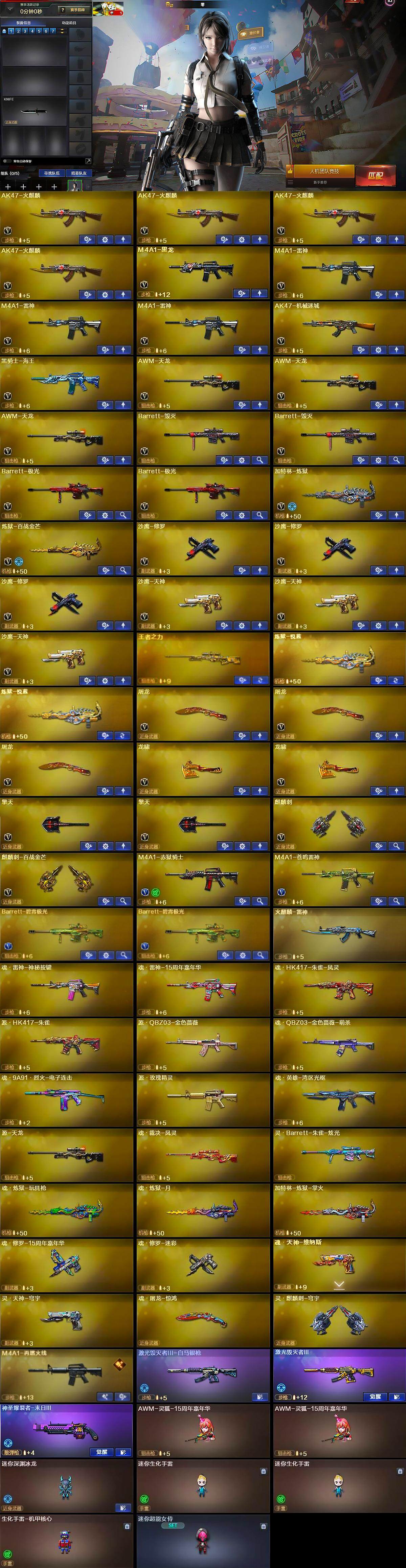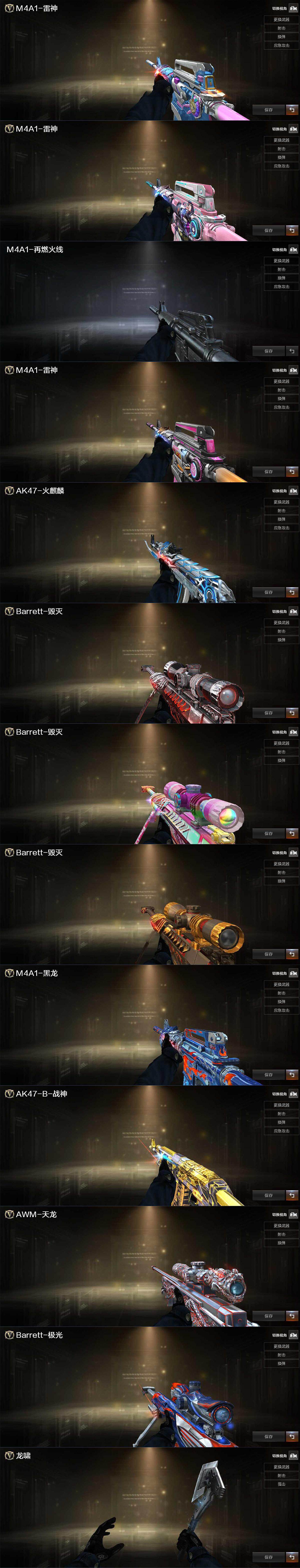 【英雄级武器】:AK47-火麒麟*4,M4A1-黑龙,M4A1-雷神*3,AK47-机械迷城,黑骑士-海王,AWM-天龙*3,Barrett-毁灭*2,Barrett-极光*2,加特林-炼狱,炼狱-百战金芒,沙鹰-修罗*3,沙鹰-天神*3,屠龙*3,龙啸*2,擎天*2,麒麟刺,麒麟刺-百战金芒,M4A1-赤狱骑士,M4A1-苍鸣雷神,Barrett-碧霄极光*2