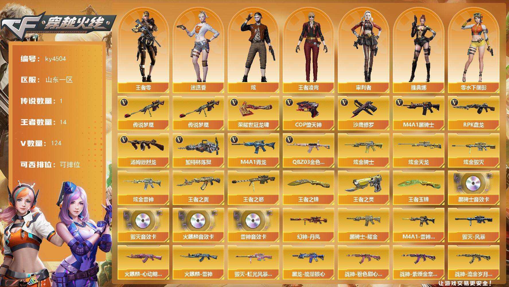 [15248777]山东一区-124V-14王者-7炫金 【传说武器】:传说梦魇 【热门武器】:传说梦魇,QBZ03-金色蔷薇,M4A1-青龙,M4A1-黑骑士,汤姆逊-烈龙*3,RPK-盘龙,加特林-炼狱*4,COP-堕天神,沙鹰-修罗*4,荣耀世冠-龙啸 【王者炫金武器】:王者之翼,王者之怒*3,王者之灵,王者之锋,王者玉锋,炫金骑士,炫金雷神*4,炫金毁灭,炫金天龙 【音效卡】:AK47-火麒麟音效卡,M4A1-雷神音效卡,M4A1-黑骑士音效卡,Barrett-毁灭音效卡 【皮肤】:幻神-丹凤,裁决-胜者为王 皮肤,M4A1-雷神-CFS 2019,火麒麟-雷神,火麒麟-心动糖果,毁灭-风暴,毁灭-虹光风暴 皮肤,黑龙-能量核心,黑骑士耀金皮肤,战神-粉色甜心皮肤,战神-紫绶金章皮肤,战神-流金岁月皮肤,麒麟刺-萌杀皮肤 【角色】:炫,迷迭香,审判者,王者-零,王者凌霄,暗夜-X,初恋灵狐,娟娟,兰妹妹,零-水下丽影,麻雀,潘多拉-X,潘多拉-甜心教官,斯沃特-X,蜀雪,铁骑荣耀,影武者-X,雅典娜 【人偶武器】:火麒麟-灵狐*2,M4A1-雷神-精英刀锋,巴雷特-零-水下丽影,迷你深渊冰龙,闪光弹-小乔 【暴走生化】:超级对讲机 【挑战大师】:致命乱世-超越Max,试炼破坏者III 【英雄级武器】:M4A1-千变,AK47-火麒麟*3,M4A1-黑龙*5,M4A1-雷神*2,M4A1-黑骑士,AK47-无影*4,AK47-黑武士*6,AK12-天启,AK47-黑鲨*4,M4A1-龙血*4,M4A1-雷霆*2,M4A1-青龙,M4A1-堕天神,无影-神兵利器,M4A1-玫瑰精灵*2,QBZ03-金色蔷薇,王者之心-觉醒版,王者之武-觉醒版,王者之魄-觉醒版,AK-47-猩红传说,AK47-B-战神,AWM-天龙,Barrett-毁灭*2,Barrett-极光*2,AWM-裁决*2,Barrett-朱雀,王者之光-觉醒版,RPK-盘龙,加特林-炼狱*4,汤姆逊-烈龙*3,烈龙-悦心-觉醒版,AA-12-雷霆,沙鹰-修罗*4,COP-雷霆*2,COP-堕天神,屠龙*2,龙啸,麒麟刺-堕天神,擎天*2,麒麟刺*3,荣耀世冠-龙啸,龙啸-堕天神,王者之锋-觉醒版,王者之啸-觉醒版,高爆手雷-雷霆*7,高爆手雷-堕天神*6,闪光弹-雷霆*7,闪光弹-堕天神*6,烟雾弹-雷霆*7,烟雾弹