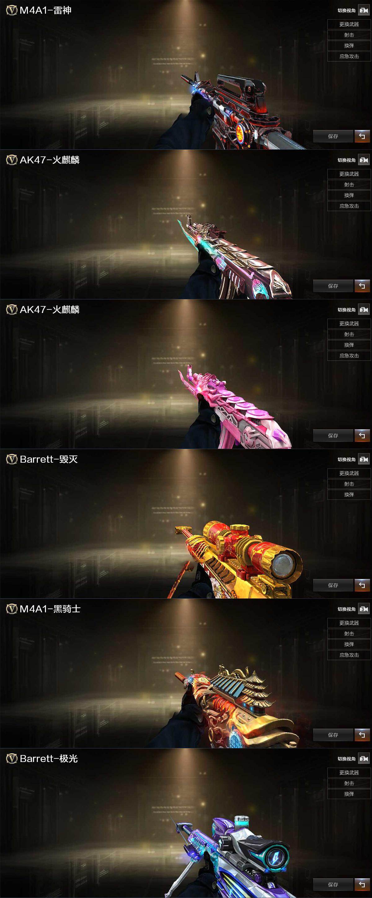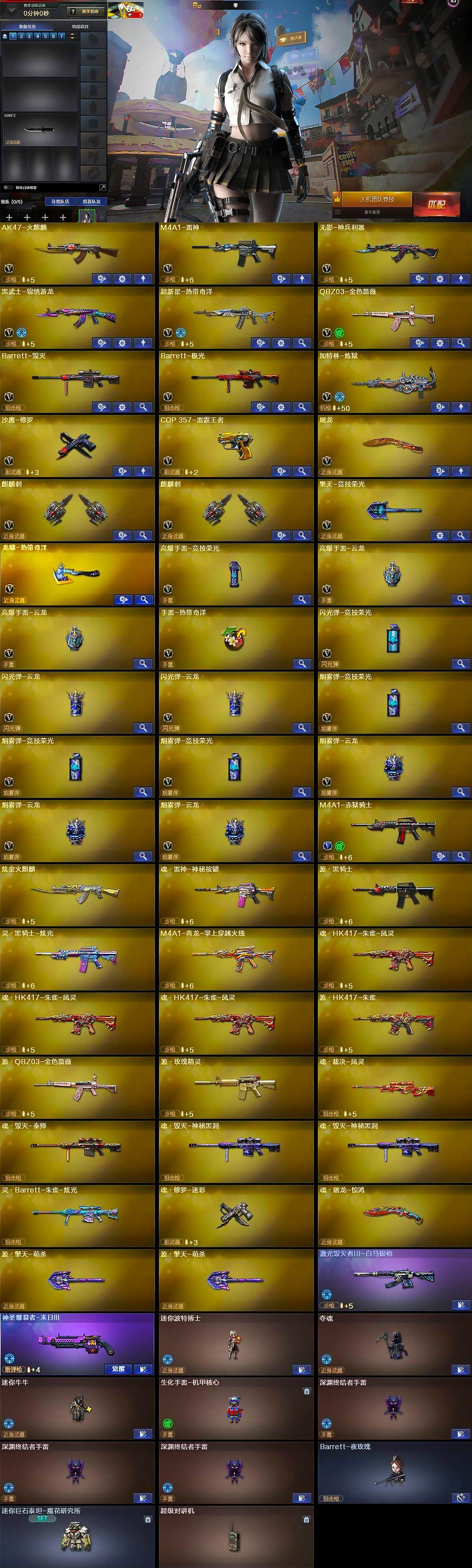 【英雄级武器】:AK47-火麒麟,M4A1-雷神,无影-神兵利器,黑武士-锦绣游龙,超新星-热带奇洋,QBZ03-金色蔷薇,Barrett-毁灭,Barrett-极光,加特林-炼狱,沙鹰-修罗,COP 357-雷霆王者-觉醒版,屠龙,麒麟刺*2,擎天-竞技荣光,龙啸-热带奇洋,高爆手雷-竞技荣光,高爆手雷-云龙*2,手雷-热带奇洋,闪光弹-竞技荣光,闪光弹-云龙*2,烟雾弹-竞技荣光*3,烟雾弹-云龙*3,M4A1-赤狱骑士