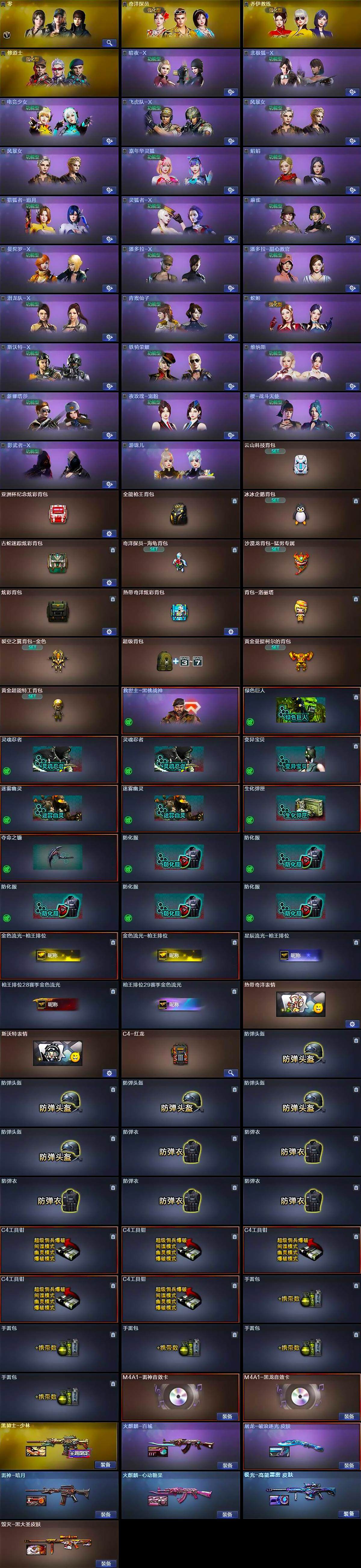 【道具】:云山科技背包,亚洲杯纪念炫彩背包,全能枪王背包,冰冰企鹅背包,古蛇迷踪炫彩背包,奇洋探员-海龟背包,沙漠龙背包-猛男专属,炫彩背包,热带奇洋炫彩背包,背包-洛丽塔,裂空之翼背包-金色,超级背包,黄金曼提柯尔的背包,黄金超能特工背包,哔哩哔哩名片,救世主-黑桃战神,绿色巨人,灵魂忍者*2,变异宝贝,迷雾幽灵*2,生化弹匣,夺命之镰,防化服*5,金色流光-枪王排位*2,星辰流光-枪王排位,枪王排位28赛季金色流光,枪王排位29赛季金色流光,热带奇洋表情,斯沃特表情,C4-红龙,防弹头盔*5,防弹衣*5,C4工具钳*5,手雷包*5