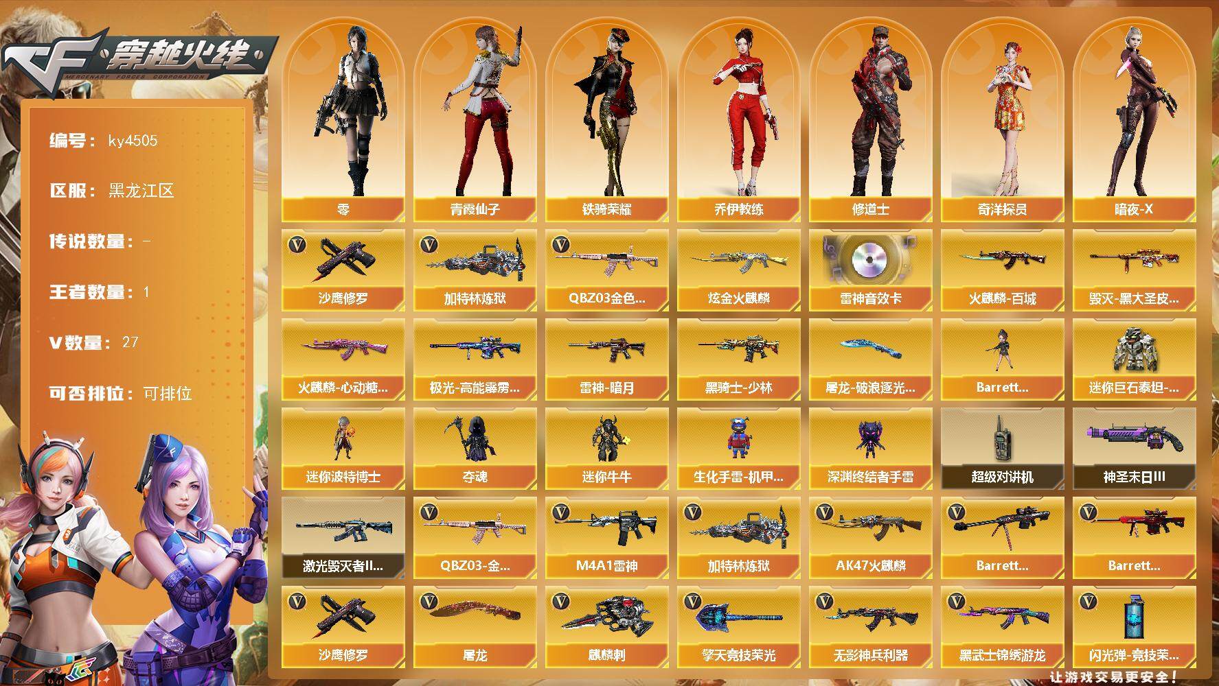 [15248796]黑龙江区-27V-1王者-1炫金 【热门武器】:QBZ03-金色蔷薇,加特林-炼狱,沙鹰-修罗 【王者炫金武器】:炫金火麒麟 【音效卡】:M4A1-雷神音效卡 【皮肤】:雷神-暗月,火麒麟-百城,火麒麟-心动糖果,毁灭-黑大圣皮肤,黑骑士-少林,极光-高能霹雳 皮肤,屠龙-破浪逐光 皮肤 【角色】:零,奇洋探员,乔伊教练,修道士,暗夜-X,北极狐-X,电竞少女,飞虎队-X,风暴女*2,嘉年华灵狐,娟娟,猎狐者-追月,灵狐者-X,麻雀,曼陀罗-X,潘多拉-X,潘多拉-甜心教官,潜龙队-X,青霞仙子,蛇姬,斯沃特-X,铁骑荣耀,兔囡囡,维纳斯,新娜塔莎,夜玫瑰-宠粉,樱-战斗天使,影武者-X,游珑儿 【人偶武器】:迷你波特博士,夺魂,迷你牛牛,生化手雷-机甲核心,深渊终结者手雷*3,Barrett-夜玫瑰,迷你巨石泰坦-魔花研究所 【暴走生化】:超级对讲机 【挑战大师】:激光毁灭者III-白马银枪,神圣爆裂者-末日III 【英雄级武器】:AK47-火麒麟,M4A1-雷神,无影-神兵利器,黑武士-锦绣游龙,超新星-热带奇洋,QBZ03-金色蔷薇,Barrett-毁灭,Barrett-极光,加特林-炼狱,沙鹰-修罗,COP 357-雷霆王者-觉醒版,屠龙,麒麟刺*2,擎天-竞技荣光,龙啸-热带奇洋,高爆手雷-竞技荣光,高爆手雷-云龙*2,手雷-热带奇洋,闪光弹-竞技荣光,闪光弹-云龙*2,烟雾弹-竞技荣光*3,烟雾弹-云龙*3,M4A1-赤狱骑士 【道具】:云山科技背包,亚洲杯纪念炫彩背包,全能枪王背包,冰冰企鹅背包,古蛇迷踪炫彩背包,奇洋探员-海龟背包,沙漠龙背包-猛男专属,炫彩背包,热带奇洋炫彩背包,背包-洛丽塔,裂空之翼背包-金色,超级背包,黄金曼提柯尔的背包,黄金超能特工背包,哔哩哔哩名片,救世主-黑桃战神,绿色巨人,灵魂忍者*2,变异宝贝,迷雾幽灵*2,生化弹匣,夺命之镰,防化服*5,金色流光-枪王排位*2,星辰流光-枪王排位,枪王排位28赛季金色流光,枪王排位29赛季金色流光,热带奇洋表情,斯沃特表情,C4-红龙,防弹头盔*5,防弹衣*5,C4工具钳*5,手雷包*5 【特殊枪械】:1炼狱