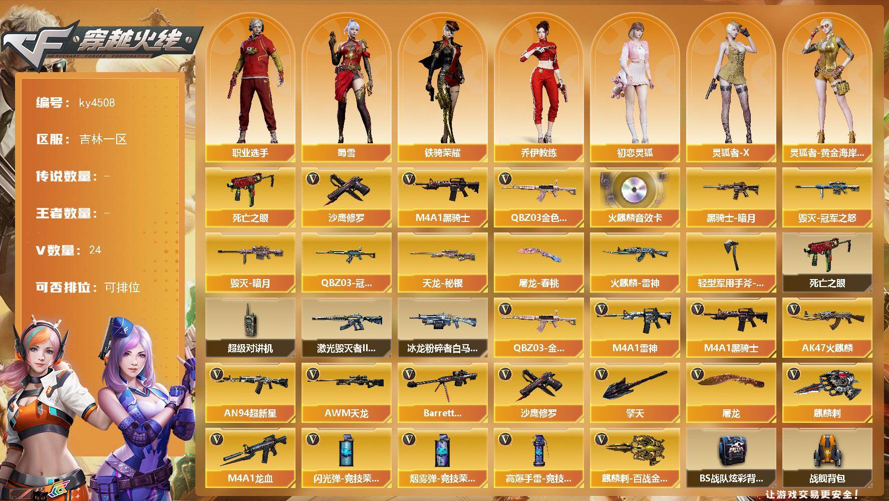 [15248824]吉林一区-24V-0王者-0炫金 【热门武器】:QBZ03-金色蔷薇,死亡之眼,M4A1-黑骑士,沙鹰-修罗 【音效卡】:AK47-火麒麟音效卡 【皮肤】:QBZ03-冠军之薇,火麒麟-雷神,毁灭-暗月*2,毁灭-冠军之怒,黑骑士-暗月,天龙-秘银,屠龙-春桃 皮肤,轻型军用手斧-再燃火线 【角色】:乔伊教练,初恋灵狐,灵狐者-X,灵狐者-黄金海岸,龙儿,潘多拉-甜心教官,蜀雪,铁骑荣耀,新娜塔莎,樱-战斗天使,影武者-X,职业选手 【暴走生化】:死亡之眼,超级对讲机 【挑战大师】:冰龙粉碎者-白马银枪,激光毁灭者III-白马银枪 【英雄级武器】:AK47-火麒麟,M4A1-雷神,M4A1-黑骑士,AN94-超新星,M4A1-龙血,QBZ03-金色蔷薇,AWM-天龙,Barrett-毁灭,沙鹰-修罗,屠龙*2,擎天,麒麟刺,麒麟刺-百战金芒,高爆手雷-竞技荣光*3,闪光弹-竞技荣光*3,烟雾弹-竞技荣光*3 【道具】:BS战队炫彩背包,战舰背包,女皇终结者-魔龙之吻,绿色巨人,灵魂忍者,迷雾幽灵,夺命之镰,防化服*2,金色流光-枪王排位,星辰流光-枪王排位,枪王排位28赛季金色流光,枪王排位29赛季金色流光,电玩兔兔表情,动感闪耀表情,防弹头盔*3,防弹衣*3,C4工具钳*3,手雷包*3 【特殊枪械】:1黑骑士