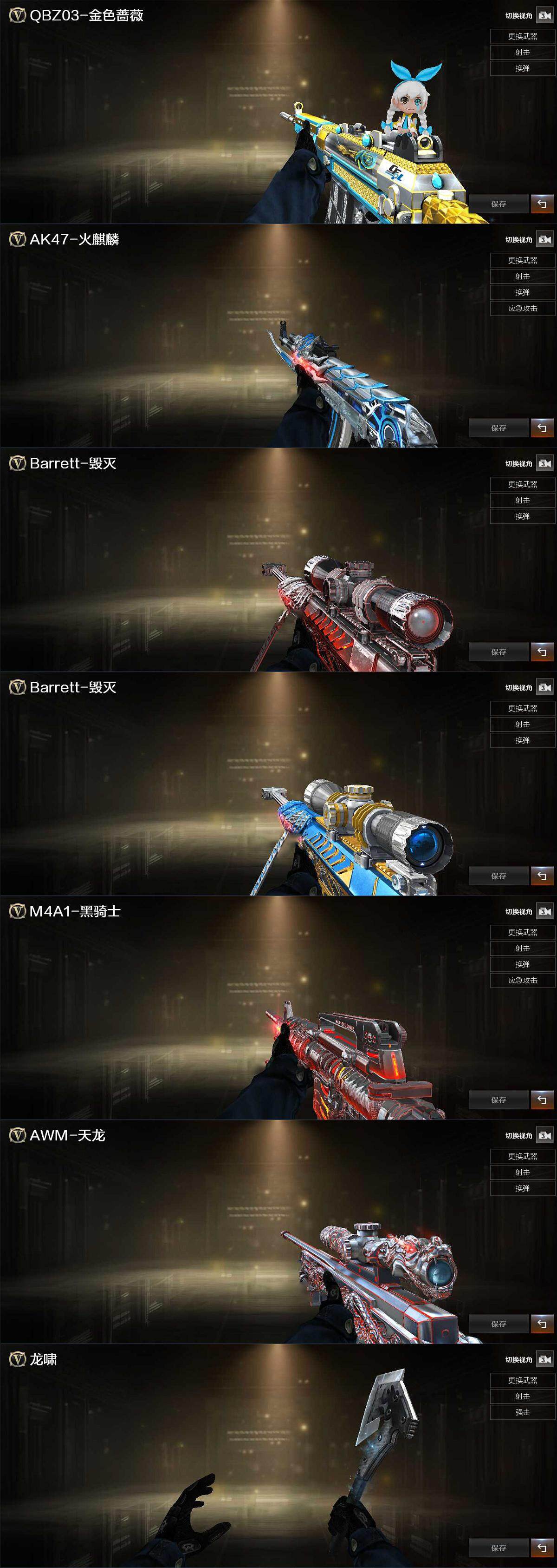 【皮肤】:QBZ03-冠军之薇,火麒麟-雷神,毁灭-暗月*2,毁灭-冠军之怒,黑骑士-暗月,天龙-秘银,屠龙-春桃 皮肤,轻型军用手斧-再燃火线