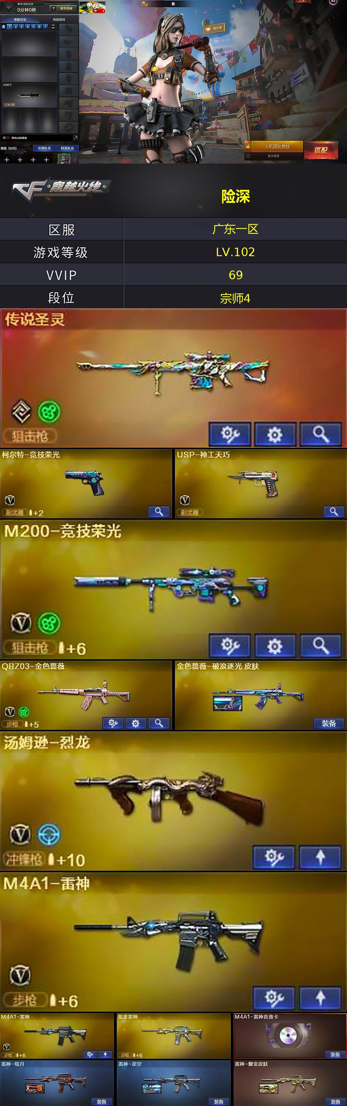 [15312467]广东一区-67V-5王者-4炫金 【传说武器】:传说圣灵 【热门武器】:传说圣灵,QBZ03-金色蔷薇,HK417-朱雀,M200-竞技荣光,死亡之眼,M4A1-黑骑士,汤姆逊-烈龙,加特林-炼狱,降世魔童,沙鹰-修罗*2 【王者炫金武器】:炫金雷神,炫金武士,炫金毁灭,炫金修罗 【音效卡】:M4A1-雷神音效卡,M4A1-黑骑士音效卡 【皮肤】:金色蔷薇-破浪逐光 皮肤,雷神-暗月,雷神-星空,雷神-耀金皮肤,火麒麟-华夏之心,火麒麟-平天大圣*2,火麒麟-百城,火麒麟-心动糖果,毁灭-黑大圣皮肤,毁灭-神秘黑洞皮肤,黑龙-暗月,M4A1-黑龙-361,黑骑士-暗月*3,无影-能量核心,死神-秘银,天启-暗月*2,AK47-B-常胜将军-曹操,AK47-B-常胜将军-刘备,天龙-能量核心,极光-能量核心,Barrett-金色蔷薇-蛇姬 皮肤,修罗-能量核心,修罗-星空,屠龙-破浪逐光 皮肤*2,龙啸-蛇姬 皮肤 【角色】:葵,电竞教官-云悠悠,审判者,蛇隐宗,乔伊教练,修道士,空,暗夜-X,初恋灵狐,芳心审判者,风暴女,嘉年华灵狐,娟娟,猎狐者-追月,零-水下丽影,灵狐者-七夕宝贝,潘多拉-X,青霞仙子,蛇姬,斯沃特-X,铁骑荣耀,维纳斯,新娜塔莎,雪莉杨-摸金校尉,夜玫瑰-宠粉,影武者-X,智影 【人偶武器】:AWM-灵狐-15周年嘉年华,迷你深渊冰龙,迷你裂空之翼*2,迷你波特博士*2,迷你牛牛,降世魔童 【暴走生化】:死亡之眼,超级对讲机 【挑战大师】:冰龙粉碎者-白马银枪,激光毁灭者III-白马银枪,激光毁灭者III*2,机甲撕裂者III,试炼破坏者III,神圣爆裂者-末日III*3,阐释者III 【英雄级武器】:AK47-火麒麟,M4A1-黑龙,M4A1-雷神*2,M4A1-黑骑士,AK47-无影,M4A1-死神,AK47-黑武士,AK12-天启,AN94-超新星,HK417-朱雀,无影-神兵利器,黑武士-锦绣游龙,QBZ03-金色蔷薇,王者火魄-觉醒版,黑武士-CF网剧冠军,AWM-天龙,Barrett-毁灭,Barrett-极光,Barrett-朱雀,M200-竞技荣光,Barrett-金色蔷薇,加特林-炼狱,汤姆逊-烈龙,沙鹰-修罗*2,沙鹰-天神*2,柯尔特-竞技荣光,USP-神工天巧,天神-CF网剧冠军,屠龙,龙啸,擎天,擎天-竞技荣光,唐刀