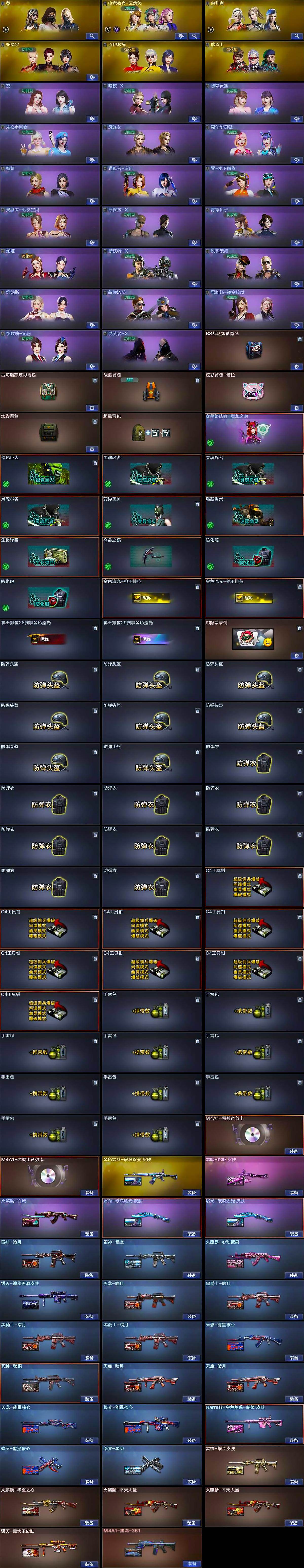 【英雄级武器】:AK47-火麒麟,M4A1-黑龙,M4A1-雷神*2,M4A1-黑骑士,AK47-无影,M4A1-死神,AK47-黑武士,AK12-天启,AN94-超新星,HK417-朱雀,无影-神兵利器,黑武士-锦绣游龙,QBZ03-金色蔷薇,王者火魄-觉醒版,黑武士-CF网剧冠军,AWM-天龙,Barrett-毁灭,Barrett-极光,Barrett-朱雀,M200-竞技荣光,Barrett-金色蔷薇,加特林-炼狱,汤姆逊-烈龙,沙鹰-修罗*2,沙鹰-天神*2,柯尔特-竞技荣光,USP-神工天巧,天神-CF网剧冠军,屠龙,龙啸,擎天,擎天-竞技荣光,唐刀