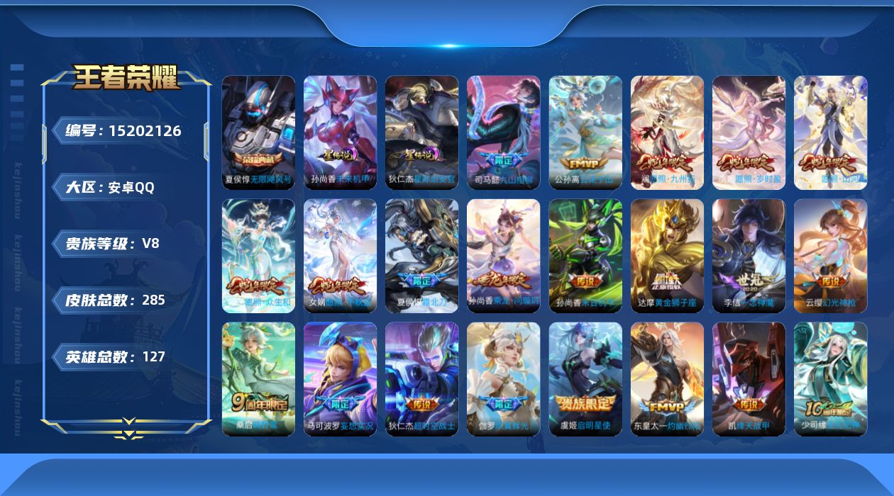 [15202126]【店主推荐捡漏号!可直接换绑】安卓Q-V8-永恒钻石IV段位-127英雄-285皮肤-1典藏皮肤-23传说-81史诗-2星元