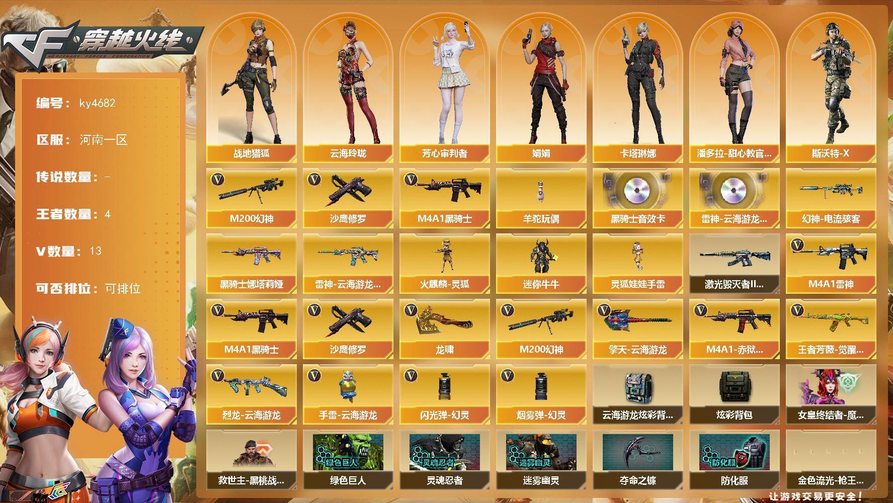 [15316563]河南一区-13V-4王者-0炫金 【热门武器】:M200-幻神,M4A1-黑骑士,羊驼玩偶,沙鹰-修罗*2 【音效卡】:M4A1-雷神-云海游龙音效卡,M4A1-黑骑士音效卡 【皮肤】:幻神-电流骇客 皮肤,雷神-云海游龙皮肤,M4A1-黑骑士-娜塔莉娅 皮肤 【角色】:战地猎狐,云海玲珑,芳心审判者,娟娟,卡塔琳娜,潘多拉-甜心教官,斯沃特-X,新娜塔莎 【人偶武器】:火麒麟-灵狐,迷你牛牛,灵狐娃娃手雷 【挑战大师】:激光毁灭者III-白马银枪 【英雄级武器】:M4A1-雷神,M4A1-黑骑士,王者芳薇-觉醒版,M200-幻神,烈龙-云海游龙,沙鹰-修罗*2,龙啸,擎天-云海游龙,手雷-云海游龙,闪光弹-幻灵,烟雾弹-幻灵,M4A1-赤狱骑士 【道具】:云海游龙炫彩背包,炫彩背包,女皇终结者-魔龙之吻,救世主-黑桃战神,绿色巨人,灵魂忍者,迷雾幽灵,夺命之镰,防化服*3,金色流光-枪王排位,星辰流光-枪王排位,流光-再燃火线,枪王排位29赛季金色流光,云海游龙表情,防弹头盔*3,防弹衣*3,C4工具钳*3,手雷包*3 【特殊枪械】:1黑骑士