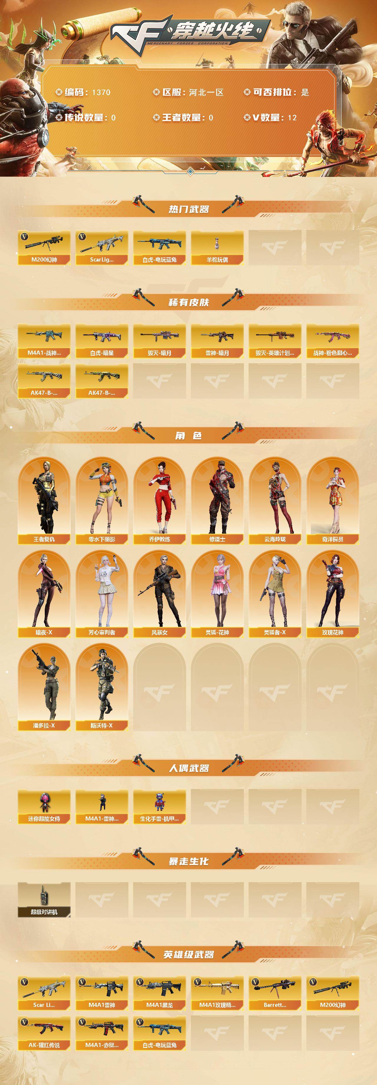 [15410440]河北一区-12V-0王者-0炫金 【热门武器】:Scar Light-白虎,M200-幻神,白虎-电玩蓝兔,羊驼玩偶 【皮肤】:Scar Light-白虎-暗星,雷神-暗月,M4A1-战神赵云,毁灭-暗月,毁灭-英雄计划 皮肤,战神-粉色甜心皮肤,AK47-B-常胜将军-刘备,AK47-B-常胜将军-孙权*2 【角色】:王者复仇,奇洋探员,乔伊教练,修道士,云海玲珑,暗夜-X,芳心审判者,风暴