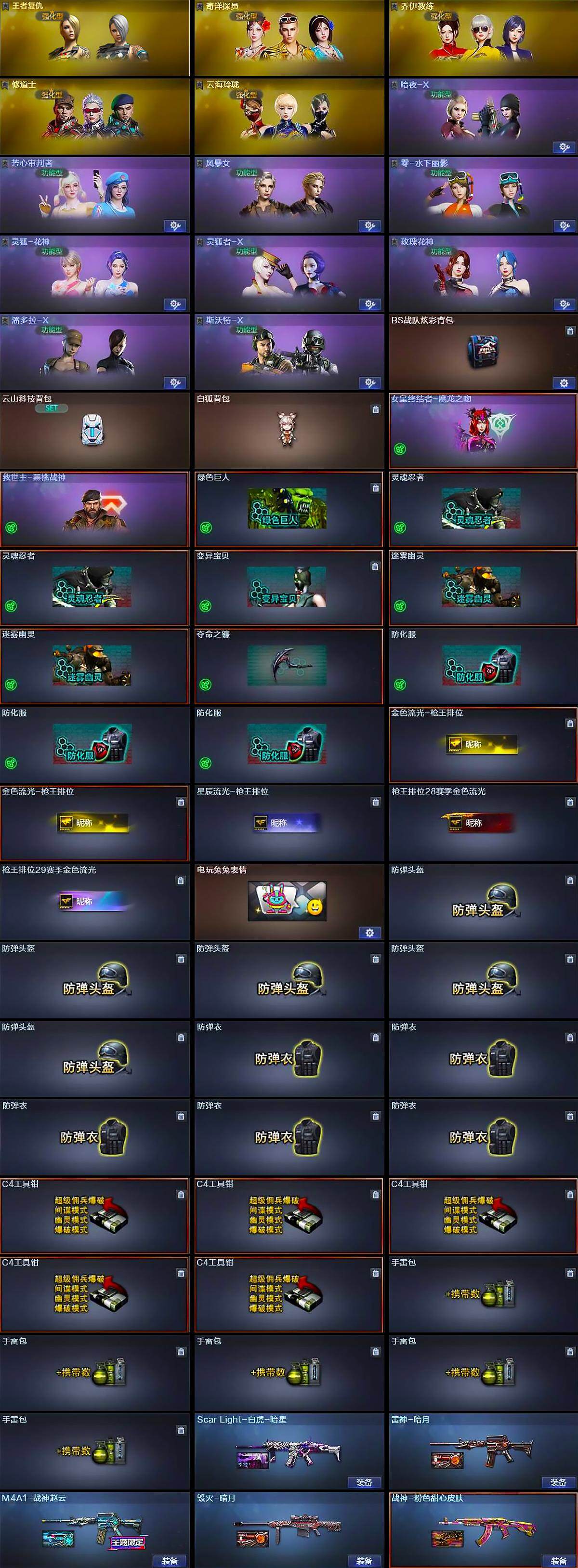 - [15675041]广东一区-83V-8王者-2炫金 【热门武器】:QBZ03-金色蔷薇,HK417-朱雀,QBZ-03-王者蔷薇,牛牛-AK47,M4A1-黑骑士,汤姆逊-烈龙,RPK-盘龙,加特林-炼狱*2,COP-白鲨,COP-堕天神*2,沙鹰-修罗*5 【王者炫金武器】:王者之武,王者之烈,QBZ-03-王者蔷薇,王者之刺,炫金骑士,炫金黑龙 【音效卡】:M4A1-黑骑士音效卡 【皮肤】:白虎-AG-CFPLS20冠军,金色蔷薇-枪娘阿敏 皮肤,雷神-暗月,雷神-宠儿-2019MVP,火麒麟-雷神,火麒麟-轻羽皮肤,毁灭-暗月,无影-能量核心,战神-粉色甜心皮肤,战神-紫绶金章皮肤,战神-流金岁月皮肤,AK47-B-常胜将军-曹操,AK47-B-常胜将军-孙权,极光-能量核心,天神-暗月*2 【角色】:零,葵,魅影,迷迭香,审判者,王者玲珑,狐影,暗夜-X,芳心审判者,嘉年华灵狐,娟娟,葵-赛博朋克,兰妹妹,零-水下丽影,灵狐者-职业经理,潘多拉-X,潘多拉-甜心教官,铁骑荣耀,新娜塔莎,影武者-X 【人偶武器】:COP-白鲨,巴雷特-零-水下丽影,AWM-灵狐-15周年嘉年华,牛牛-AK47,迷你裂空之翼,迷你牛牛,深渊终结者手雷,闪光弹-小乔,闪光弹-貂蝉,高爆手雷-大乔,迷你艾比 【挑战大师】:冰龙粉碎者-白马银枪,神圣爆裂者-末日III 【英雄级武器】:M4A1-千变,AK47-火麒麟*2,M4A1-黑龙,M4A1-雷神*2,M4A1-黑骑士,AK47-无影,AK47-黑武士,AK12-天启,AN94-超新星,M4A1-堕天神,HK417-朱雀,M4A1-玫瑰精灵,QBZ03-金色蔷薇,AK-47-猩红传说,AK47-B-战神,AK47-B-常胜将军,黑武士-CF网剧冠军,AWM-天龙,Barrett-毁灭,王者幻神-觉醒版,RPK-盘龙,加特林-炼狱*2,汤姆逊-烈龙,沙鹰-修罗*5,COP-堕天神*2,柯尔特-电竞装甲,天神-CF网剧冠军,屠龙*3,龙啸*2,麒麟刺-堕天神,擎天,麒麟刺,擎天-竞技荣光,尼泊尔-电竞装甲,龙啸-堕天神*4,擎天-CF网剧冠军,王者之击-觉醒版,高爆手雷-堕天神*6,高爆手雷-幻灵,高爆手雷-竞技荣光,闪光弹-堕天神*6,闪光弹-幻灵,闪光弹-雷霆王者-觉醒版,烟雾弹-堕天神*6 【道具】:EP战队炫彩背包,KZ战队炫彩背包,战舰背