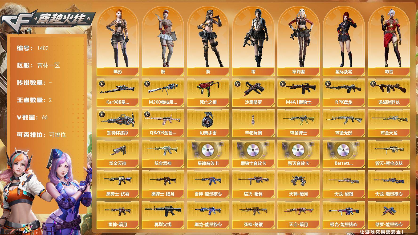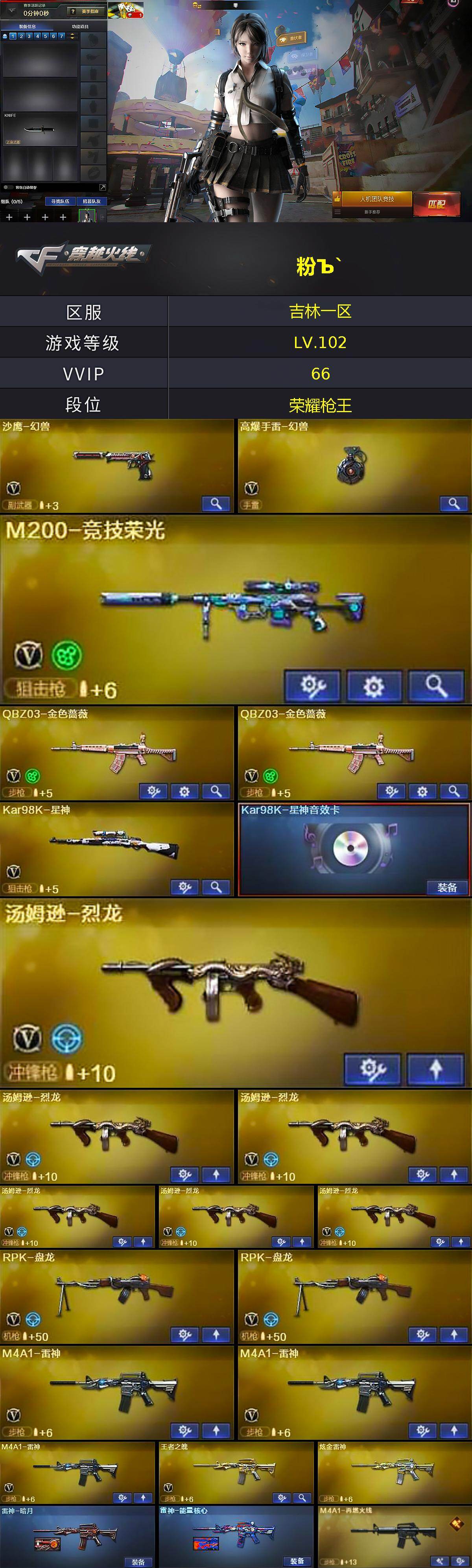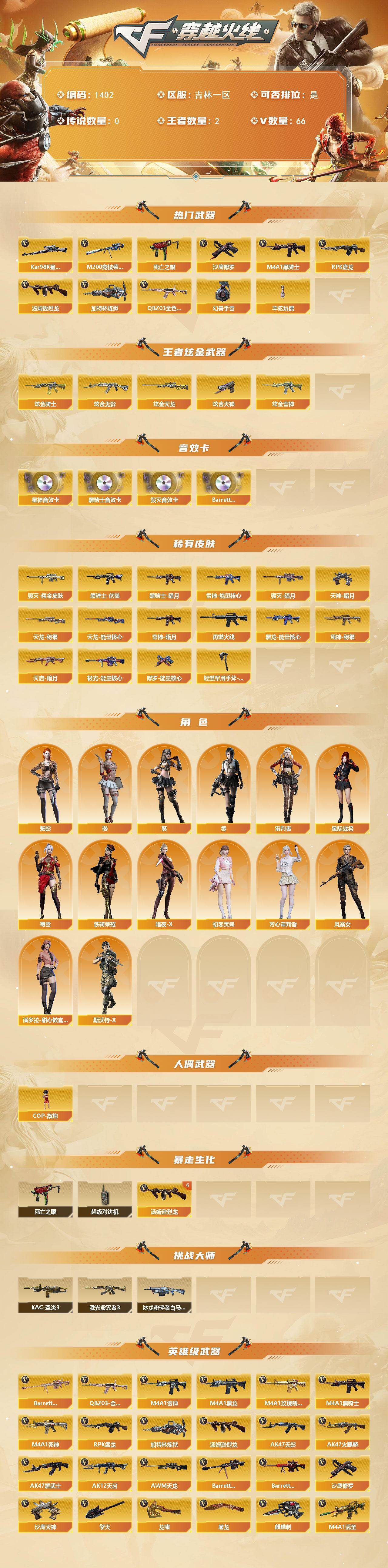 [15411861]吉林一区-66V-2王者-5炫金 【热门武器】:QBZ03-金色蔷薇*2,M200-竞技荣光,死亡之眼*4,Kar98K-星神,M4A1-黑骑士*2,汤姆逊-烈龙*6,RPK-盘龙*2,加特林-炼狱*2,羊驼玩偶,沙鹰-修罗*4,高爆手雷-幻兽 【王者炫金武器】:炫金骑士,炫金无影,炫金雷神,炫金天龙,炫金天神 【音效卡】:M4A1-黑骑士音效卡,Barrett-毁灭音效卡,Kar98K-星神音效卡,Barrett-碧霄极光音效卡*2 【皮肤】:雷神-暗月,雷神-能量核心,M4A1-再燃火线,毁灭-暗月,毁灭耀金皮肤,黑龙-能量核心,黑骑士-暗月,黑骑士-伏羲,死神-秘银,天启-暗月*2,天龙-秘银,天龙-能量核心,极光-能量核心,修罗-能量核心,天神-暗月,轻型军用手斧-再燃火线 【角色】:零,葵,樱,魅影,星际战将,审判者,暗夜-X,初恋灵狐,芳心审判者,风暴女,潘多拉-甜心教官,斯沃特-X,蜀雪,铁骑荣耀 【人偶武器】:COP-旗袍 【暴走生化】:死亡之眼*4,超级对讲机 【挑战大师】:冰龙粉碎者-白马银枪,激光毁灭者III,KAC-圣炎切割者III 【英雄级武器】:M4A1-千变*2,AK47-火麒麟,M4A1-黑龙,M4A1-雷神*3,M4A1-黑骑士*2,AK47-无影,M4A1-死神,AK47-黑武士,AK12-天启,M4A1-武圣,M4A1-玫瑰精灵,QBZ03-金色蔷薇*2,M4A1-猎神,王者之魄-觉醒版,黑骑士-海王,AWM-天龙*2,Barrett-毁灭,Barrett-极光,Kar98K-星神,M200-竞技荣光,Barrett-金色蔷薇,RPK-盘龙*2,加特林-炼狱*2,汤姆逊-烈龙*6,沙鹰-修罗*4,沙鹰-天神,沙鹰-幻兽,Glock18-武圣,屠龙*4,龙啸,擎天,麒麟刺,女皇利刃-幻兽,麒麟刺-百战金芒,王者之啸-觉醒版,高爆手雷-幻兽,闪光弹-幻兽,烟雾弹-幻兽,M4A1-苍鸣雷神,Barrett-碧霄极光 【道具】:BS战队炫彩背包,云山科技背包,战舰背包,炫彩背包,百战金芒炫彩背包,背包-洛丽塔,超级背包,女皇终结者-魔龙之吻,救世主-黑桃战神,绿色巨人,灵魂忍者,变异宝贝,迷雾幽灵,夺命之镰,防化服*3,流光-鎏金之域,枪王排位29赛季金色流光,萌萌小葵表情,循环实验表情,防弹头盔*3,防弹衣*3,C4工具钳*3,手雷