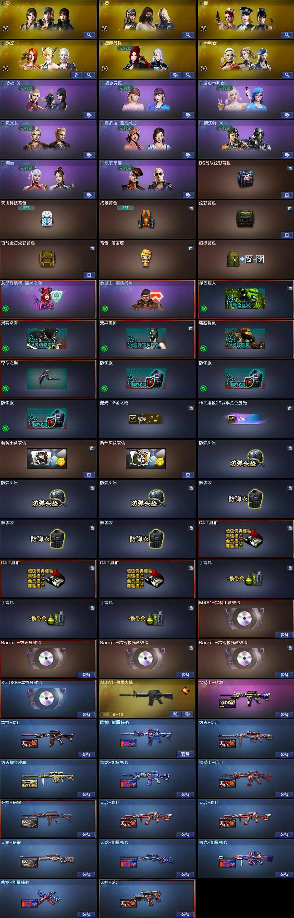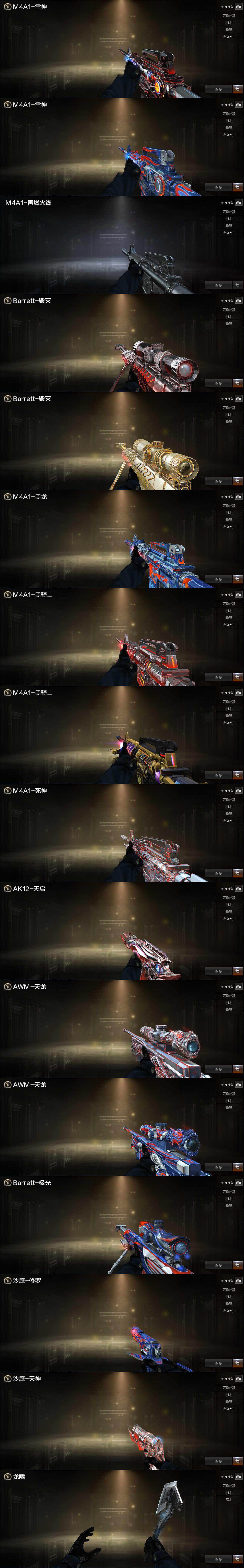 【英雄级武器】:M4A1-千变*2,AK47-火麒麟,M4A1-黑龙,M4A1-雷神*3,M4A1-黑骑士*2,AK47-无影,M4A1-死神,AK47-黑武士,AK12-天启,M4A1-武圣,M4A1-玫瑰精灵,QBZ03-金色蔷薇*2,M4A1-猎神,王者之魄-觉醒版,黑骑士-海王,AWM-天龙*2,Barrett-毁灭,Barrett-极光,Kar98K-星神,M200-竞技荣光,Barrett-金色蔷薇,RPK-盘龙*2,加特林-炼狱*2,汤姆逊-烈龙*6,沙鹰-修罗*4,沙鹰-天神,沙鹰-幻兽,Glock18-武圣,屠龙*4,龙啸,擎天,麒麟刺,女皇利刃-幻兽,麒麟刺-百战金芒,王者之啸-觉醒版,高爆手雷-幻兽,闪光弹-幻兽,烟雾弹-幻兽,M4A1-苍鸣雷神,Barrett-碧霄极光