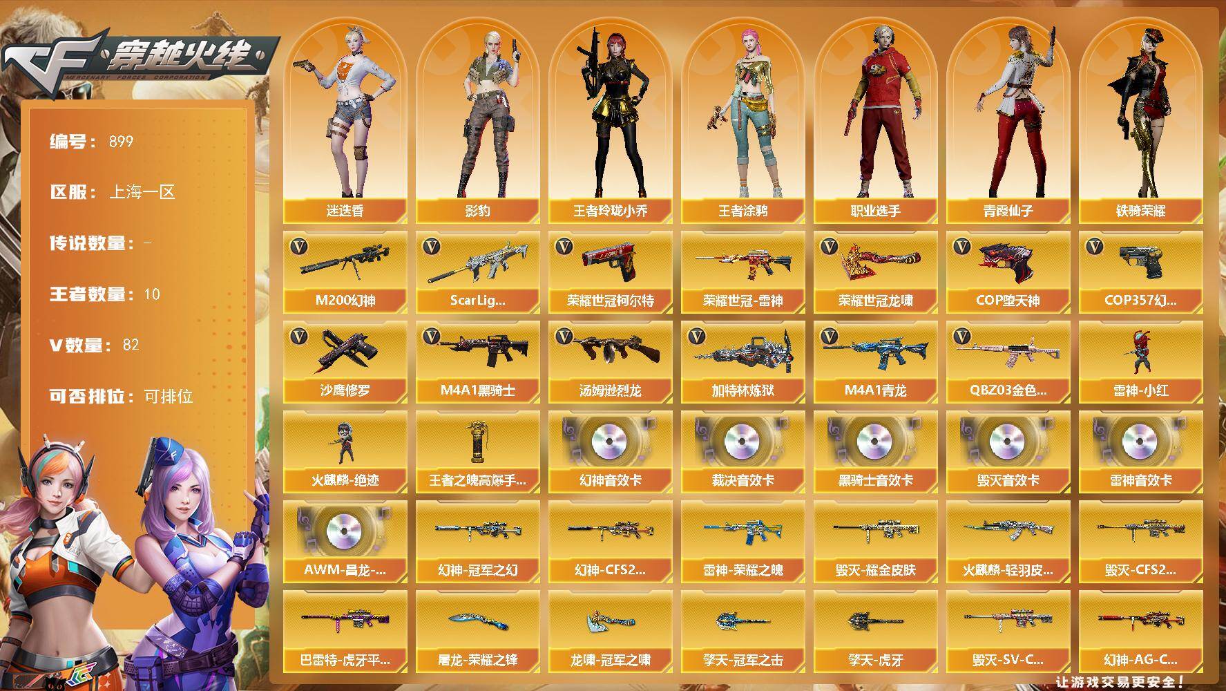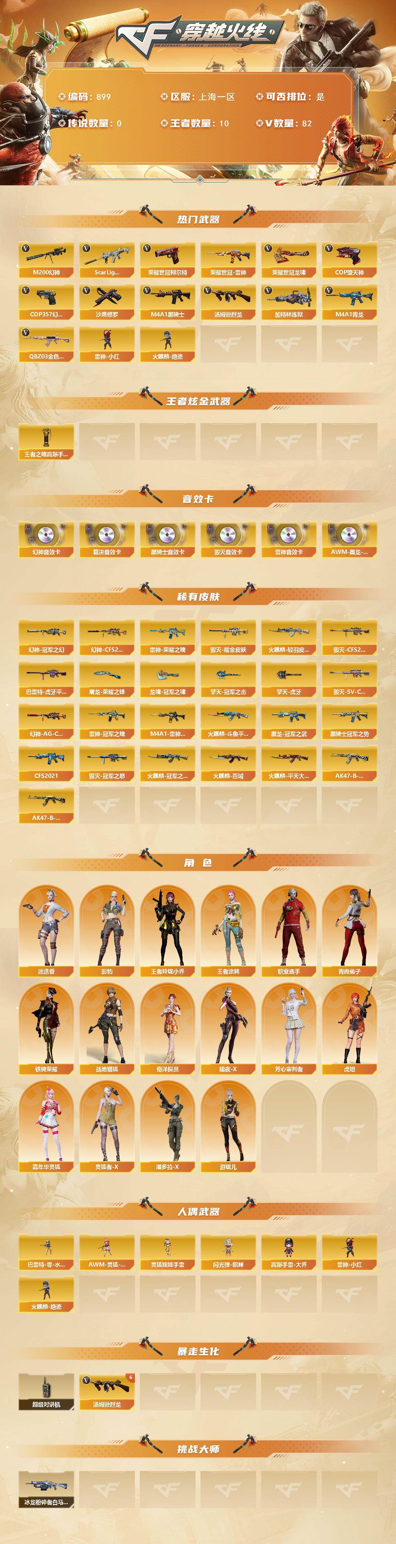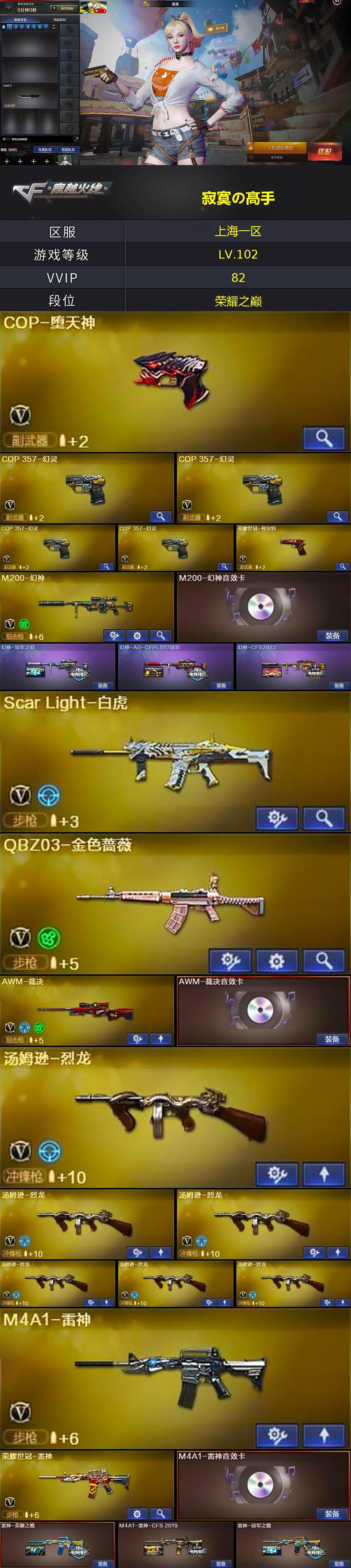 [15412392]上海一区-82V-10王者-0炫金 【热门武器】:QBZ03-金色蔷薇,Scar Light-白虎,M4A1-青龙,M200-幻神,荣耀世冠-雷神,荣耀世冠-柯尔特,M4A1-黑骑士*3,汤姆逊-烈龙*6,加特林-炼狱,雷神-小红,火麒麟-绝迹,COP-堕天神,COP 357-幻灵*4,沙鹰-修罗*4,荣耀世冠-龙啸 【王者炫金武器】:王者之魄高爆手雷*5 【音效卡】:M200-幻神音效卡,M