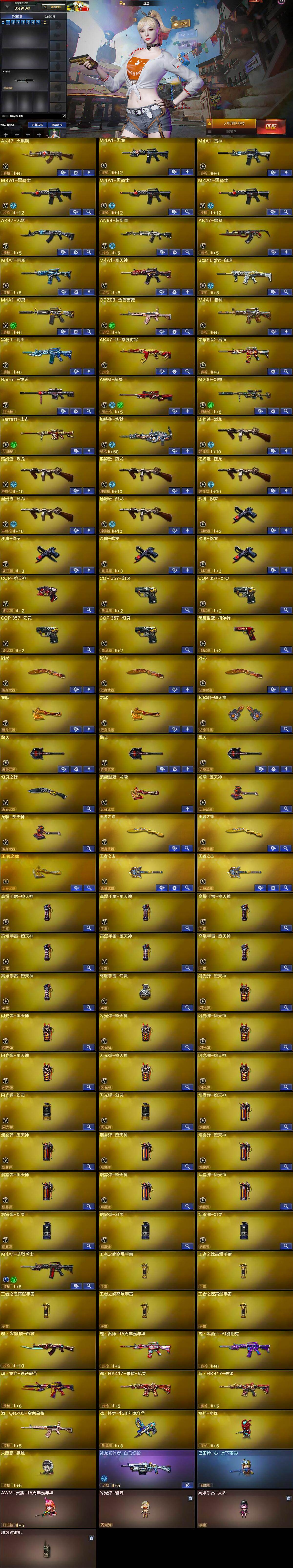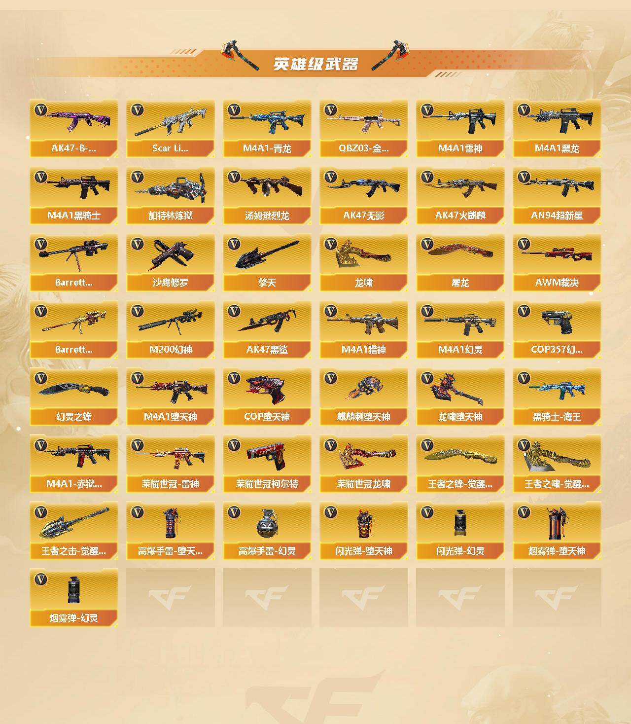 【热门武器】:QBZ03-金色蔷薇,Scar Light-白虎,M4A1-青龙,M200-幻神,荣耀世冠-雷神,荣耀世冠-柯尔特,M4A1-黑骑士*3,汤姆逊-烈龙*6,加特林-炼狱,雷神-小红,火麒麟-绝迹,COP-堕天神,COP 357-幻灵*4,沙鹰-修罗*4,荣耀世冠-龙啸