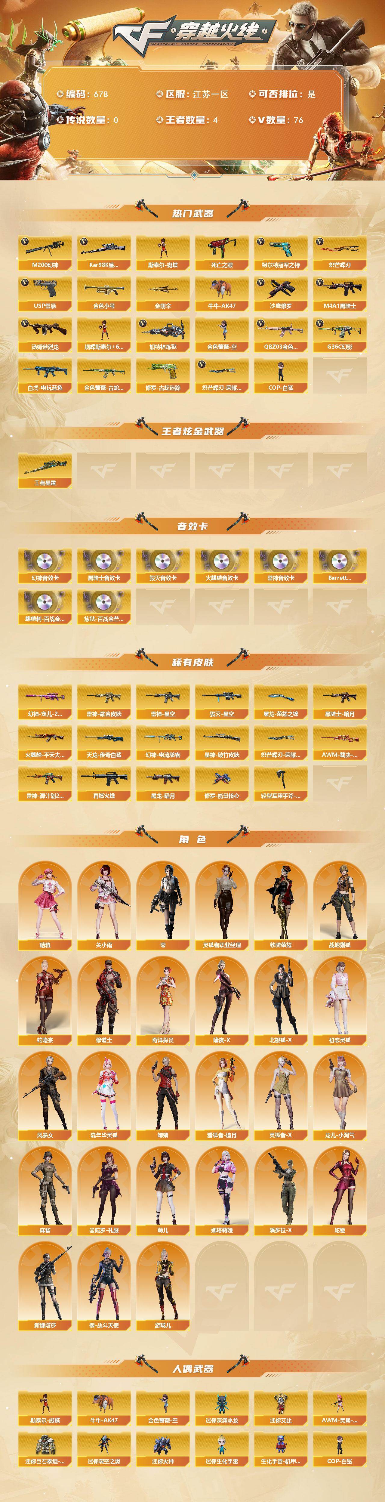 [15354864]江苏一区-76V-4王者-0炫金 【热门武器】:G36C-幻影,QBZ03-金色蔷薇,M200-幻神,金色蔷薇-古蛇迷踪,修罗-古蛇迷踪,死亡之眼,白虎-电玩蓝兔,柯尔特-冠军之特,Kar98K-星神,金色小号,牛牛-AK47,M4A1-黑骑士,汤姆逊-烈龙*6,加特林-炼狱,金色蔷薇-空,斯泰尔-蝴蝶,COP-白鲨,USP-雷暴*2,沙鹰-修罗*6,炽芒蝶刃*2,炽芒蝶刃-荣耀世冠白鲨2023 皮肤,金刚伞 【王者炫金武器】:王者星霆 【音效卡】:M200-幻神音效卡,AK47-火麒麟音效卡,M4A1-雷神音效卡,M4A1-黑骑士音效卡,Barrett-毁灭音效卡,Barrett-碧霄极光音效卡,麒麟刺-百战金芒-盛典舞曲音效卡,炼狱-百战金芒-庆典舞曲音效卡 【皮肤】:幻神-宠儿-2021MVP,幻神-电流骇客 皮肤,AWM-裁决-凤灵皮肤,星神-破竹皮肤,雷神-星空,雷神-耀金皮肤,雷神-源计划2.0专属 皮肤,M4A1-再燃火线,火麒麟-平天大圣,毁灭-星空,黑龙-暗月*6,黑骑士-暗月,AWM-天龙-传奇白鲨,修罗-能量核心,屠龙-荣耀之锋,轻型军用手斧-再燃火线,炽芒蝶刃-荣耀世冠白鲨2023 皮肤 【角色】:零,关小雨,晴雅,战地猎狐,蛇隐宗,奇洋探员,修道士,暗夜-X,北极狐-X,初恋灵狐,风暴女,嘉年华灵狐,娟娟,猎狐者-追月,灵狐者-X,灵狐者-职业经理,龙儿-小淘气,麻雀,曼陀罗-礼服,萌儿,娜塔莉娅,潘多拉-X,蛇姬,铁骑荣耀,新娜塔莎,樱-战斗天使,游珑儿 【人偶武器】:COP-白鲨,金色蔷薇-空,迷你宝贝,斯泰尔-蝴蝶,AWM-灵狐-15周年嘉年华,牛牛-AK47,迷你深渊冰龙,迷你裂空之翼,迷你火种,迷你生化手雷,生化手雷-机甲核心*2,迷你艾比,迷你巨石泰坦-魔花研究所 【暴走生化】:死亡之眼,超级对讲机 【挑战大师】:神圣爆裂者III,试炼破坏者III,KAC-圣炎切割者III,神圣爆裂者-末日III,惩戒者III 【英雄级武器】:AK47-火麒麟,M4A1-黑龙,M4A1-雷神,M4A1-黑骑士,M4A1-武圣,AK47-雷暴,无影-神兵利器,G36C-幻影,黑武士-锦绣游龙,超新星-热带奇洋,金色蔷薇-古蛇迷踪,M4A1-玫瑰精灵,QBZ03-金色蔷薇,王者之翼-觉醒版,王者之武-觉醒版,黑骑士-海王,白虎-电玩蓝兔,AWM-