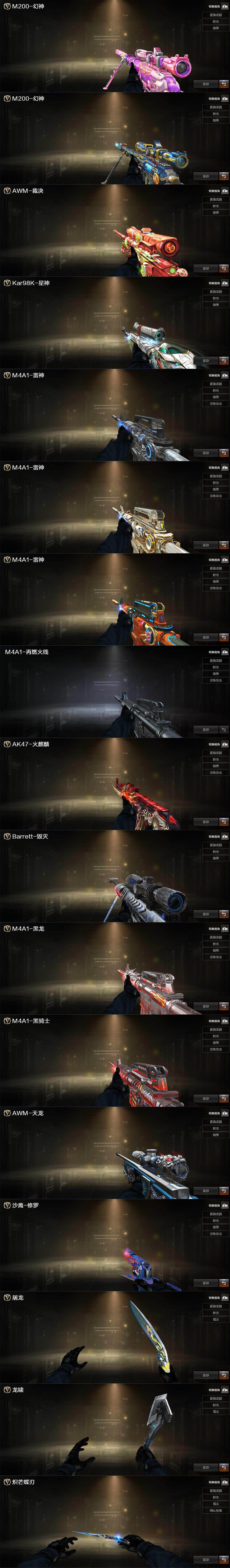 【英雄级武器】:AK47-火麒麟,M4A1-黑龙,M4A1-雷神,M4A1-黑骑士,M4A1-武圣,AK47-雷暴,无影-神兵利器,G36C-幻影,黑武士-锦绣游龙,超新星-热带奇洋,金色蔷薇-古蛇迷踪,M4A1-玫瑰精灵,QBZ03-金色蔷薇,王者之翼-觉醒版,王者之武-觉醒版,黑骑士-海王,白虎-电玩蓝兔,AWM-