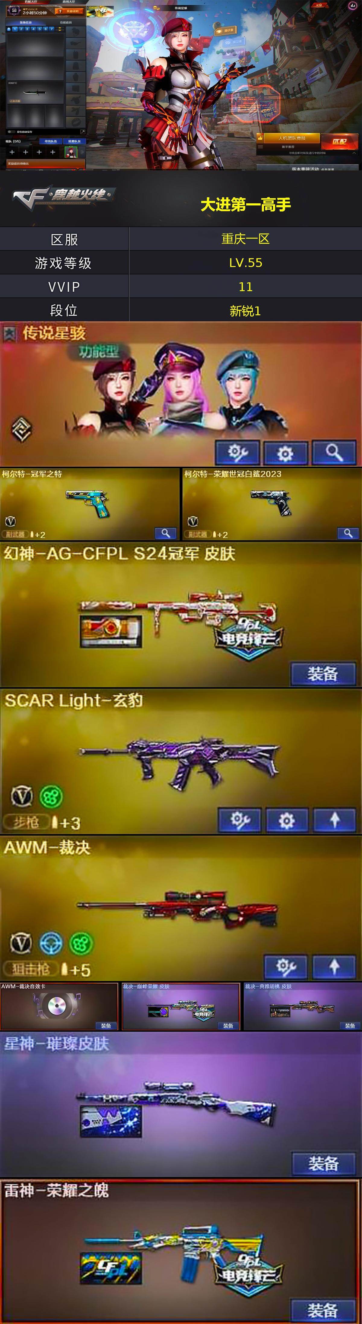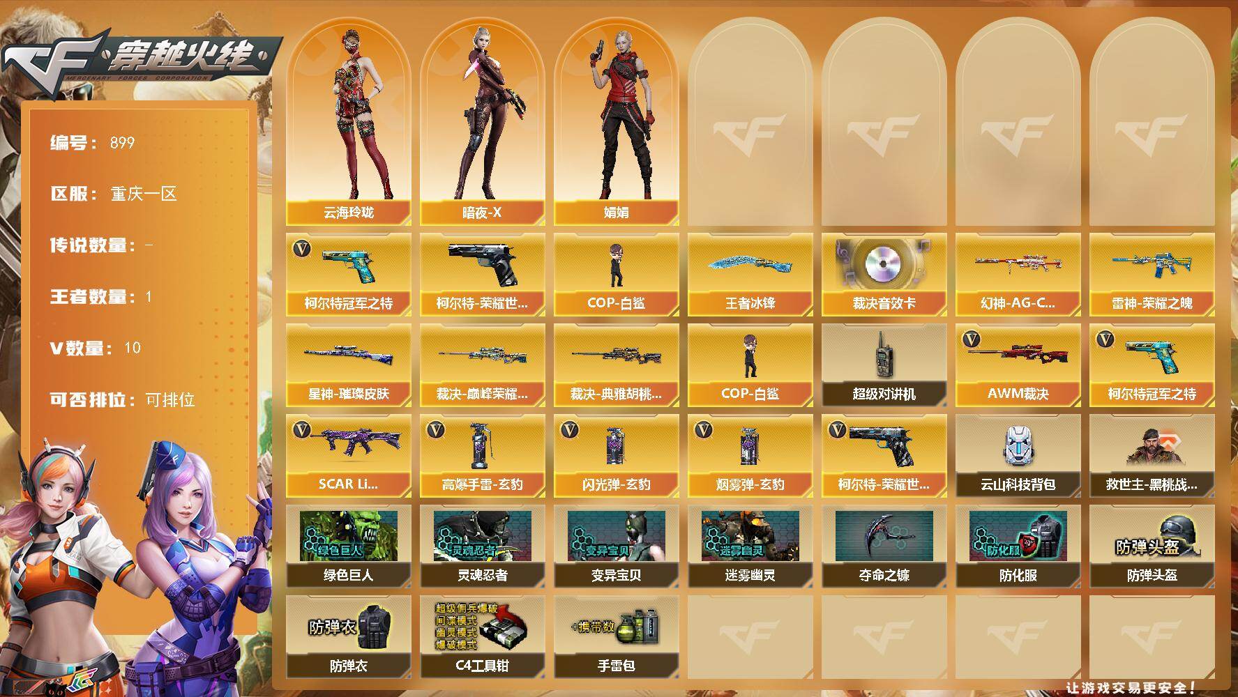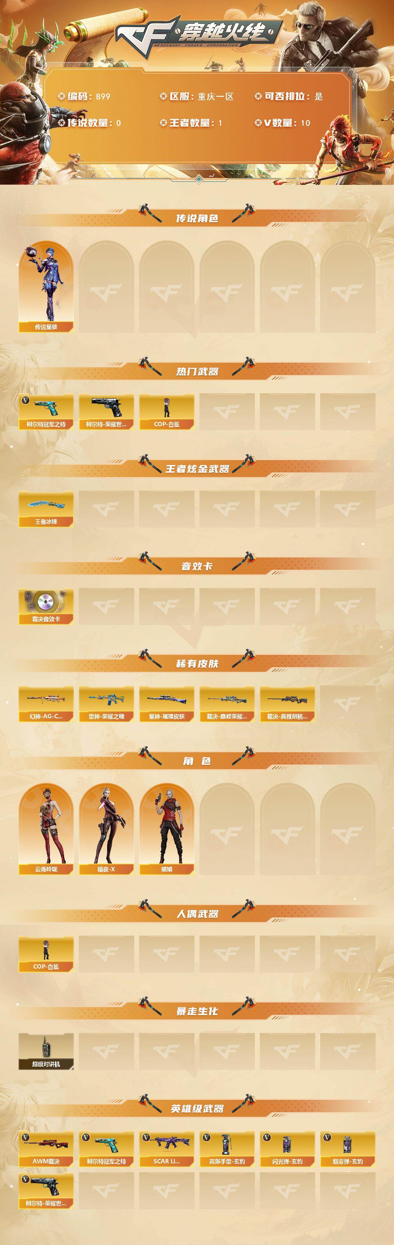 [15414683]重庆一区-10V-1王者-0炫金 【传说角色】:传说星骇 【热门武器】:柯尔特-荣耀世冠白鲨2023,柯尔特-冠军之特,COP-白鲨 【王者炫金武器】:王者冰锋 【音效卡】:AWM-裁决音效卡 【皮肤】:幻神-AG-CFPL S24冠军 皮肤,裁决-巅峰荣耀 皮肤,裁决-典雅胡桃 皮肤,星神-璀璨皮肤,雷神-荣耀之魄 【角色】:云海玲珑,暗夜-X,娟娟 【人偶武器】:COP-白鲨 【暴走生化】:超级对讲机 【英雄级武器】:SCAR Light-玄豹,AWM-裁决,柯尔特-冠军之特,柯尔特-荣耀世冠白鲨2023,高爆手雷-玄豹,闪光弹-玄豹*2,烟雾弹-玄豹*2 【道具】:云山科技背包,救世主-黑桃战神,绿色巨人,灵魂忍者,变异宝贝,迷雾幽灵,夺命之镰,防化服*2,防弹头盔*2,防弹衣*2,C4工具钳*2,手雷包*2 【特殊枪械】: