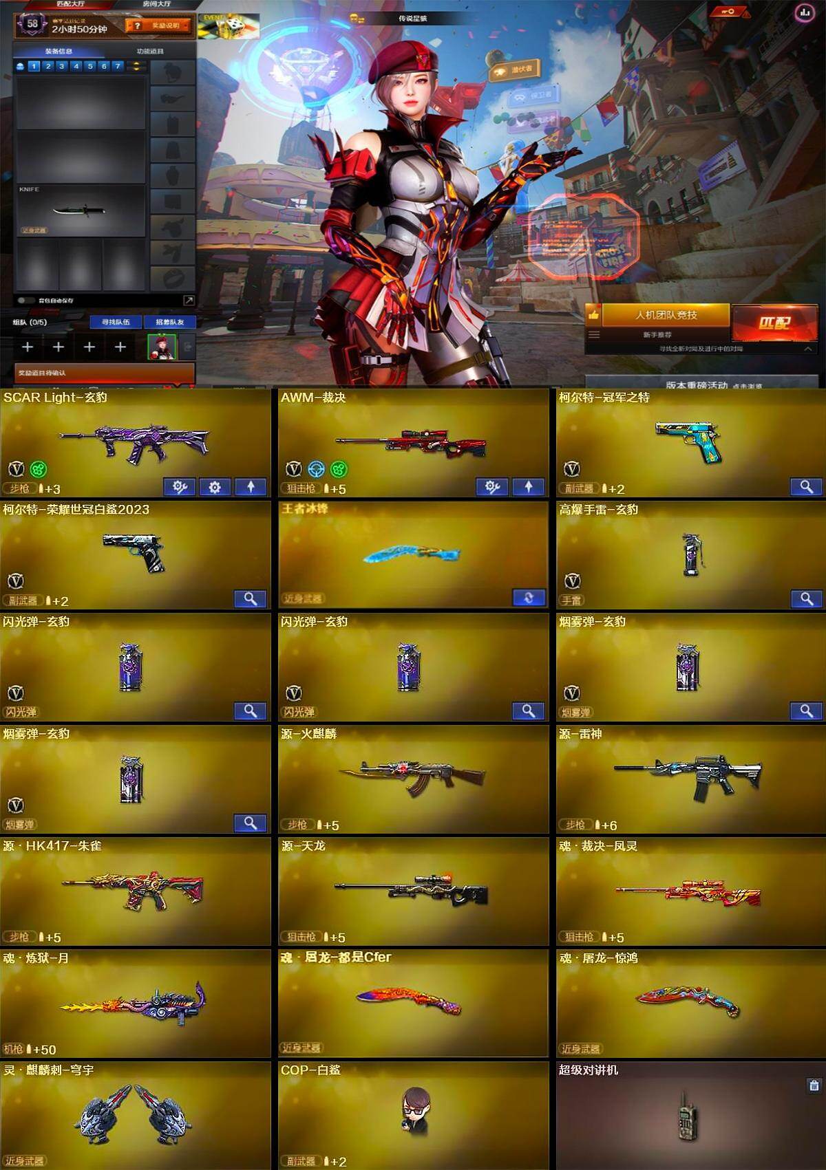 【英雄级武器】:SCAR Light-玄豹,AWM-裁决,柯尔特-冠军之特,柯尔特-荣耀世冠白鲨2023,高爆手雷-玄豹,闪光弹-玄豹*2,烟雾弹-玄豹*2