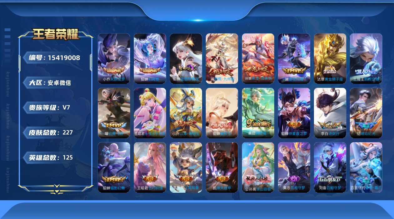 [15419008]安卓WX-V7-最强王者段位-125英雄-227皮肤-2典藏皮肤-18传说-75史诗-1星传说