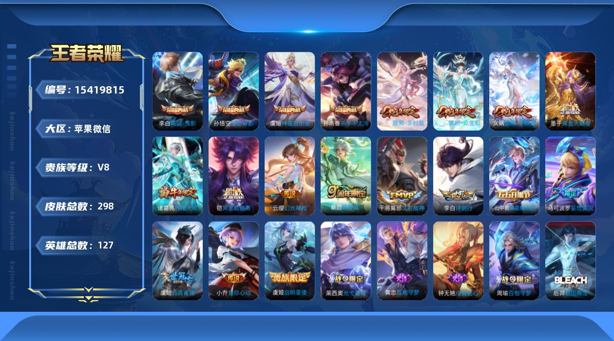 [15419815]苹果WX-V8-最强王者段位-127英雄-298皮肤-4典藏皮肤-16传说-103史诗 【英雄全皮】:刘禅全皮,孙权全皮 【荣耀典藏】:孙悟空全息碎影,孙尚香杀手不太冷,李白鸣剑曳影,虞姬神鉴启示录 【传说皮肤】:后羿神树通天,女娲愿照千秋盛,妲己愿照众生和,虞姬愿照岁时盈,云缨幻光神枪,桑启鸣野蒿,铠冥王哈迪斯,云中君群星魔术团,墨子黄金天蝎座,马可波罗妄想实况,李白诗剑行,小乔音你心动,诸葛亮时雨天司,虞姬启明星使,干将莫邪久胜战神,虞姬云霓雀翎 【限定皮肤】:铠冥王哈迪斯,暃埋骨钱,虞姬夏日便利店,姜子牙天穹之誓,狄仁杰阴阳师,赵云皇家上将,赵云引擎之心,墨子神迹守卫,嬴政优雅恋人,孙尚香蔷薇恋人,庄周高山流水,高渐离死亡摇滚,阿轲迷踪丽影,芈月幻夜卜梦,元歌无心,夏侯惇朔风刀,典韦蓝屏警告,马可波罗妄想实况,狄仁杰魔术师,狄仁杰万华元夜,达摩星际陆战队,达摩沙漠行僧,项羽海滩派对,老夫子醍醐杖,老夫子航海奇遇记,程咬金演武夺筹,刘邦夺宝奇兵,王昭君凤凰于飞,兰陵王金庭之子,亚瑟潮玩骑士王,孙悟空美猴王,后羿圣弓游侠,李元芳云中旅人,虞姬启明星使,钟馗驱傩正仪,干将莫邪真爱魔法,雅典娜黎明之约,鬼谷子原初探秘者,鬼谷子五谷丰年,诸葛亮时雨天司,黄忠火炮绅士,苏烈千军破阵,百里玄策原初追逐者,弈星混沌棋,梦奇顽趣,沈梦溪大漠名商,明世隐疑决卦,裴擒虎李小龙,裴擒虎擒涛扼浪,米莱狄胡桃异想国,猪八戒猪悟能,嫦娥拒霜思,鲁班大师探海日志,桑启海盐诗旅,艾琳流音漫舞,司空震地狱燃心,阿古朵江河有灵,张良古海寻踪,蒙犽百解令,蒙恬荣光圣徽,高渐离燃音魔法,妲己灵卜魔法,鬼谷子天穹祈灯,姬小满妄想食味,沈梦溪龙舞盛年,鲁班七号蔬乡物语,李元芳蔬乡物语,刘邦剑破天穹,上官婉儿群星魔术团,程咬金群星魔术团,云中君群星魔术团,镜青焰无极,项羽苍威无极 【年限皮肤】:孙悟空美猴王,王昭君凤凰于飞,诸葛亮时雨天司,马超神威 【赛季限定】:夏侯惇朔风刀,狄仁杰万华元夜,达摩沙漠行僧,老夫子醍醐杖,程咬金演武夺筹,兰陵王金庭之子,张良古海寻踪,李元芳云中旅人,钟馗驱傩正仪,雅典娜黎明之约,鬼谷子原初探秘者,苏烈千军破阵,百里玄策原初追逐者,弈星混沌棋,梦奇顽趣,沈梦溪大漠名商,明世隐疑决卦,裴擒虎擒涛扼浪,鲁班大师探海日志,桑启海盐诗旅,鬼谷子天穹祈灯,蒙恬荣光圣徽,刘邦剑破天穹,姜