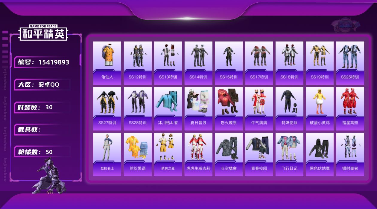 [15419893]【特价出售/店主推荐】安卓 手Q-无敌战神框-12406热力值-3王牌印记-30套装-50枪皮 【热门品类】:套装-龟仙人 【粉色降落伞】:夏日绵绵冰降落伞 【稀有套装】:套装-龟仙人 【稀有枪皮】:AKM-夜灯,AKM-破晓战魂,AKM-虎虎生威,M16A4-红色方程式,M16A4-蓝色火焰,SCAR-L-炫彩节奏,SCAR-L-红色方程式,M416-红色方程式,M416-蓝色火焰,GROZA-治愈之星,AUG-天降萌叽,AUG-耀粉歌者,QBZ-彩虹符号,QBZ-赛罗,M762-牛气冲天,M762-镭射皇者,蜜獾-天降萌叽,UZI-炫彩节奏,UZI-红色方程式,UMP45-生命誓言,UMP45-蓝色火焰,Vector-彩虹符号,Vector-治愈之星,汤姆逊-耀粉歌者,Kar98K-彩虹符号,Kar98K-炫彩节奏,Kar98K-红色方程式,M24-治愈之星,SKS-夜灯,VSS-镭射皇者,Mini14-炫彩节奏,Mini14-耀粉歌者,Mk14-治愈之星,Win94-夏日绵绵冰,S686-红色方程式,S1897-镭射皇者,S12K-破晓战魂,M249-破晓战魂,M249-镭射皇者 【其他套装】:套装-SS12特训,套装-SS13特训,套装-SS14特训,套装-SS15特训,套装-SS17特训,套装-SS18特训,套装-SS19特训,套装-SS25特训,套装-SS27特训,套装-SS28特训,套装-冰川格斗者,套装-夏日音浪,套装-怒火燎原,套装-牛气满满,套装-特殊使命,套装-破蛋小黄鸡,套装-福星高照,套装-竞技名士,套装-缤纷果语,套装-萌黄之夏,套装-虎虎生威吉莉,套装-长空猛禽,套装-青春校园,套装-飞行日记,套装-黑色伏地魔,套装-龟仙人,套装-镭射皇者,套装-银白舞王,套装-治愈之星,套装-科技之星 【稀有背包】:夏日绵绵冰背包(2级) 【营地ID】:737539926