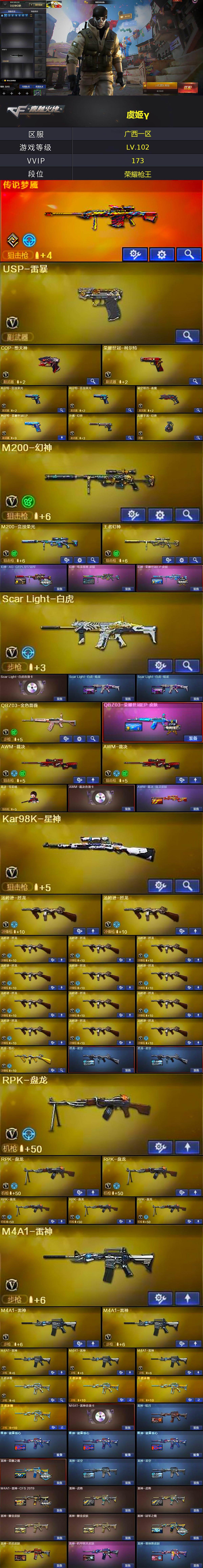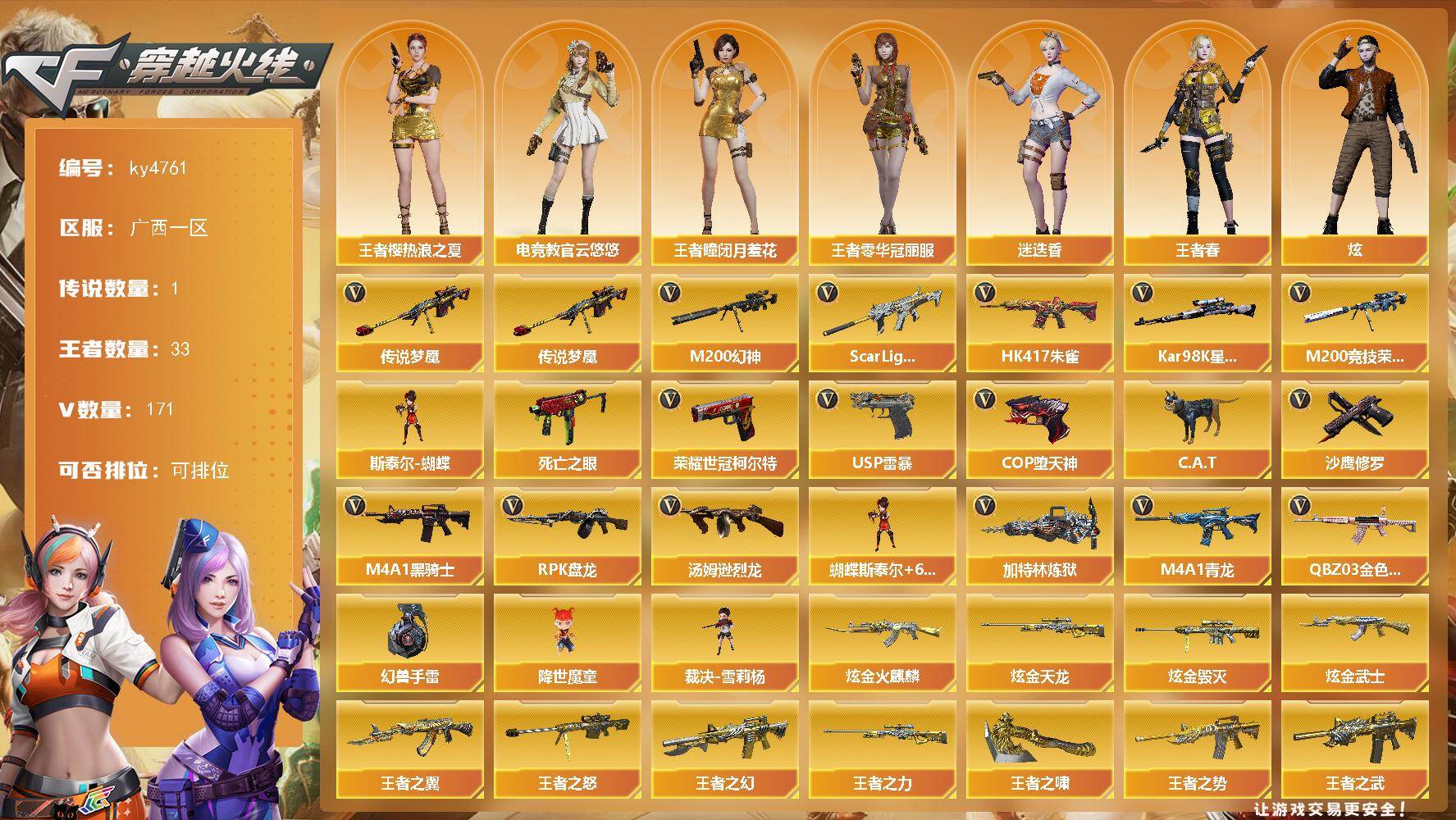 [15419955]广西一区-171V-33王者-4炫金 【传说武器】:传说梦魇 【热门武器】:传说梦魇,QBZ03-金色蔷薇,Scar Light-白虎,HK417-朱雀,M4A1-青龙,M200-幻神,M200-竞技荣光,死亡之眼,荣耀世冠-柯尔特,Kar98K-星神,C.A.T,M4A1-黑骑士*2,汤姆逊-烈龙*14,RPK-盘龙*6,加特林-炼狱,斯泰尔-蝴蝶,降世魔童,裁决-雪莉杨,USP-雷暴,COP-堕天神,沙鹰-修罗*4,高爆手雷-幻兽 【王者炫金武器】:天启-悦智,王者之幻,王者之翼,王者之势,王者之武,王者之魄*3,王者之心,王者之光,王者之怒,王者之力*2,炼狱-悦蓝,王者之啸*2,炫金火麒麟,炫金武士,炫金毁灭,炫金天龙,王者之魄高爆手雷*2,王者之魄闪光弹*3 【音效卡】:AK47-火麒麟音效卡,M4A1-雷神音效卡,M4A1-黑龙音效卡,M4A1-黑骑士音效卡,Barrett-毁灭音效卡*3,Barrett-极光音效卡,AWM-裁决音效卡,Scar Light-白虎音效卡,绝迹语音包,白鲨语音包 【皮肤】:幻神-AG-CFPLS17冠军,幻神-电流骇客 皮肤,幻神-荣耀世冠EP 皮肤,Scar Light-白虎-暗星*2,QBZ03-荣耀世冠EP 皮肤,AWM-裁决-凤灵皮肤,裁决-胜者为王 皮肤,烈龙-星空*2,雷神-暗月,雷神-能量核心*3,雷神-荣耀之魄,雷神-星空*2,M4A1-雷神-CFS 2019,雷神-虎将*2,雷神-耀金皮肤*2,雷神-冠军之魄,雷神-烈虎皮肤,雷神-机甲刑天皮肤,雷神-维纳斯皮肤,火麒麟-AG战队皮肤,火麒麟-雷神,火麒麟-冠军之心,火麒麟-华夏之心,AK47-火麒麟-传奇EVEN,火麒麟-平天大圣,火麒麟-百城*2,火麒麟-心动糖果,毁灭-暗月,毁灭-荣耀之怒,毁灭耀金皮肤,毁灭-星空,毁灭-冠军之怒,毁灭-CFS2020,毁灭-SV-CFPLS16冠军,毁灭-黑大圣皮肤,毁灭-黑曼巴 皮肤,毁灭-英雄计划 皮肤,M4A1-千变-孔明皮肤,黑龙-能量核心*2,黑龙-暗月,黑骑士-暗月,黑骑士耀金皮肤,黑骑士-冠军之势,黑骑士-地狱火,黑骑士-CFS2021,无影-暗月*2,无影-能量核心*2,无影耀金皮肤,死神-机甲核心皮肤,AK47-黑武士-361*2,天龙-能量核心,AWM-天龙-传奇70KG*2,AWM-天龙-传