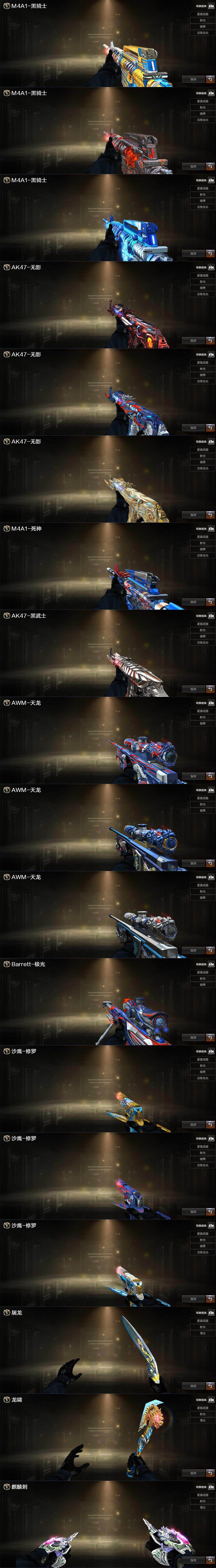 【音效卡】:AK47-火麒麟音效卡,M4A1-雷神音效卡,M4A1-黑龙音效卡,M4A1-黑骑士音效卡,Barrett-毁灭音效卡*3,Barrett-极光音效卡,AWM-裁决音效卡,Scar Light-白虎音效卡,绝迹语音包,白鲨语音包