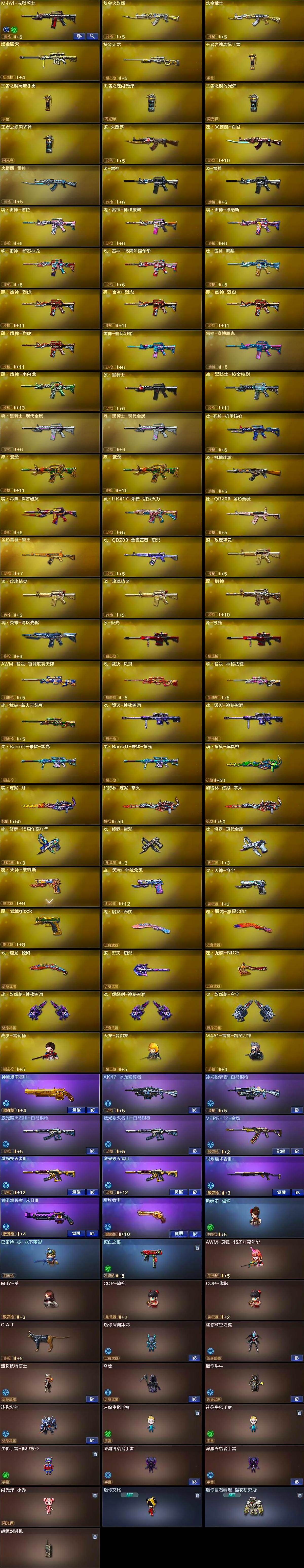 【热门武器】:传说梦魇,QBZ03-金色蔷薇,Scar Light-白虎,HK417-朱雀,M4A1-青龙,M200-幻神,M200-竞技荣光,死亡之眼,荣耀世冠-柯尔特,Kar98K-星神,C.A.T,M4A1-黑骑士*2,汤姆逊-烈龙*14,RPK-盘龙*6,加特林-炼狱,斯泰尔-蝴蝶,降世魔童,裁决-雪莉杨,USP-雷暴,COP-堕天神,沙鹰-修罗*4,高爆手雷-幻兽