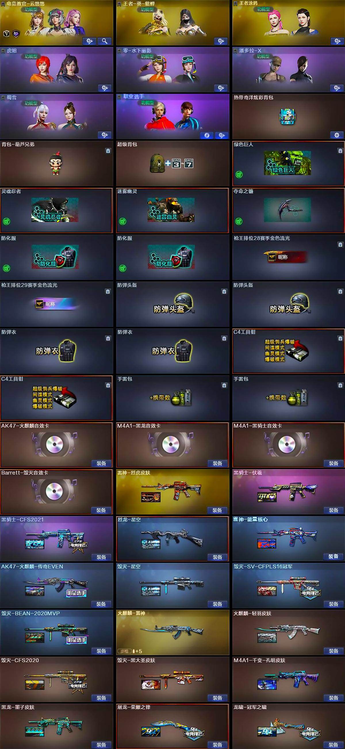 【皮肤】:烈龙-星空,雷神-能量核心,雷神-烈虎皮肤,火麒麟-雷神,AK47-火麒麟-传奇EVEN,火麒麟-轻羽皮肤,毁灭-星空,毁灭-CFS2020,毁灭-SV-CFPLS16冠军,毁灭-BEAN-2020MVP,毁灭-黑大圣皮肤,M4A1-千变-孔明皮肤,黑龙-墨子皮肤,黑骑士-CFS2021,黑骑士-伏羲,AK47-B-常胜将军-孙权,屠龙-荣耀之锋,龙啸-冠军之啸