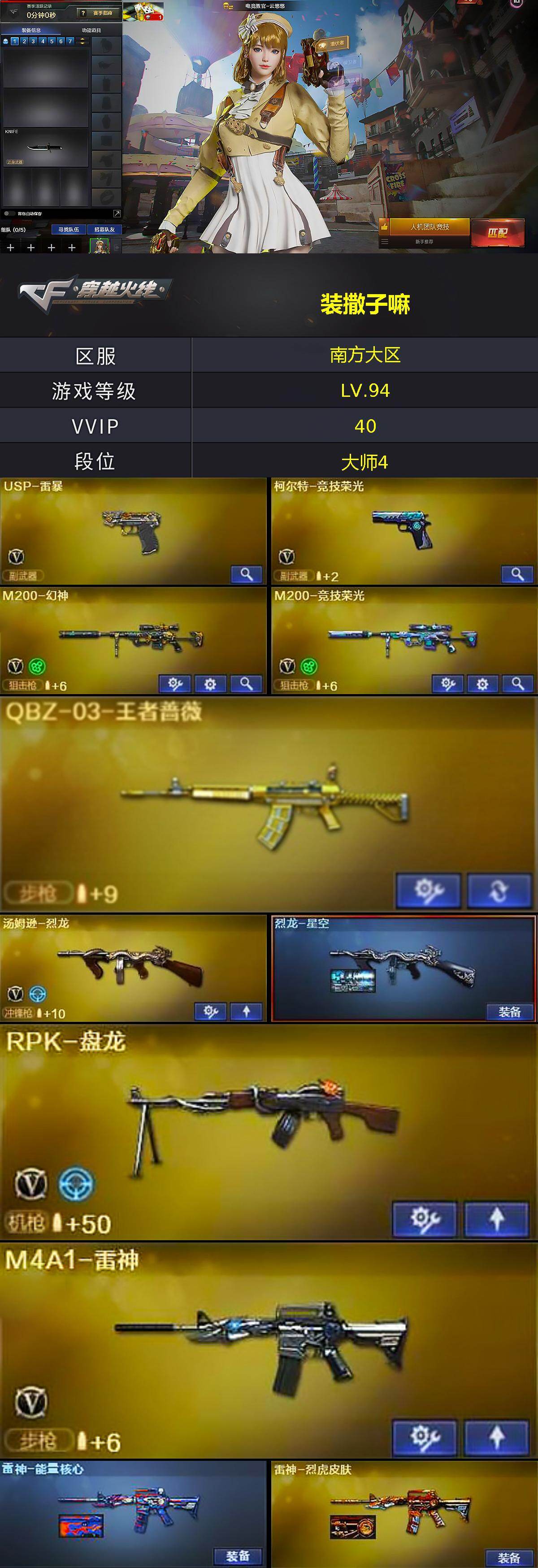 [15420872]南方大区-40V-13王者-2炫金 【热门武器】:M200-幻神,QBZ-03-王者蔷薇,M200-竞技荣光,M4A1-黑骑士,汤姆逊-烈龙,RPK-盘龙,USP-雷暴,沙鹰-修罗 【王者炫金武器】:QBZ-03-王者蔷薇,炫金黑龙,炫金毁灭,王者之魄高爆手雷*2,王者之魄闪光弹*2 【音效卡】:AK47-火麒麟音效卡,M4A1-黑骑士音效卡,Barrett-毁灭音效卡 【皮肤】:烈龙-星空,雷神-能量核心,雷神-烈虎皮肤,火麒麟-雷神,AK47-火麒麟-传奇EVEN,火麒麟-轻羽皮肤,毁灭-星空,毁灭-CFS2020,毁灭-SV-CFPLS16冠军,毁灭-BEAN-2020MVP,毁灭-黑大圣皮肤,M4A1-千变-孔明皮肤,黑龙-墨子皮肤,黑骑士-CFS2021,黑骑士-伏羲,AK47-B-常胜将军-孙权,屠龙-荣耀之锋,龙啸-冠军之啸 【角色】:电竞教官-云悠悠,王者-葵-貂蝉,王者涂鸦,虎妞,零-水下丽影,潘多拉-X,蜀雪,职业选手 【人偶武器】:COP-旗袍,深渊终结者手雷,闪光弹-小乔,闪光弹-貂蝉,高爆手雷-大乔 【英雄级武器】:AK47-火麒麟,M4A1-雷神,M4A1-黑骑士,AK47-无影,M4A1-玫瑰精灵,M4A1-猎神,王者之翼-觉醒版,王者之势-觉醒版,超新星-悦享-觉醒版,王者火魄-觉醒版,黑骑士-海王,AK47-B-常胜将军,Barrett-毁灭,M200-幻神,M200-竞技荣光,Barrett-金色蔷薇,王者之力-觉醒版,RPK-盘龙,汤姆逊-烈龙,沙鹰-修罗,沙鹰-天神,USP-雷暴,柯尔特-竞技荣光,屠龙,龙啸,麒麟刺-堕天神,擎天,麒麟刺,幻灵之锋,擎天-竞技荣光,龙啸-堕天神,高爆手雷-堕天神*2,高爆手雷-竞技荣光,闪光弹-堕天神*2,闪光弹-竞技荣光,闪光弹-雷霆王者-觉醒版,烟雾弹-堕天神*2,烟雾弹-竞技荣光 【道具】:热带奇洋炫彩背包,背包-葫芦兄弟,超级背包,绿色巨人,灵魂忍者,迷雾幽灵,夺命之镰,防化服*2,枪王排位28赛季金色流光,枪王排位29赛季金色流光,防弹头盔*2,防弹衣*2,C4工具钳*2,手雷包*2 【特殊枪械】:1黑骑士,1烈龙,1盘龙