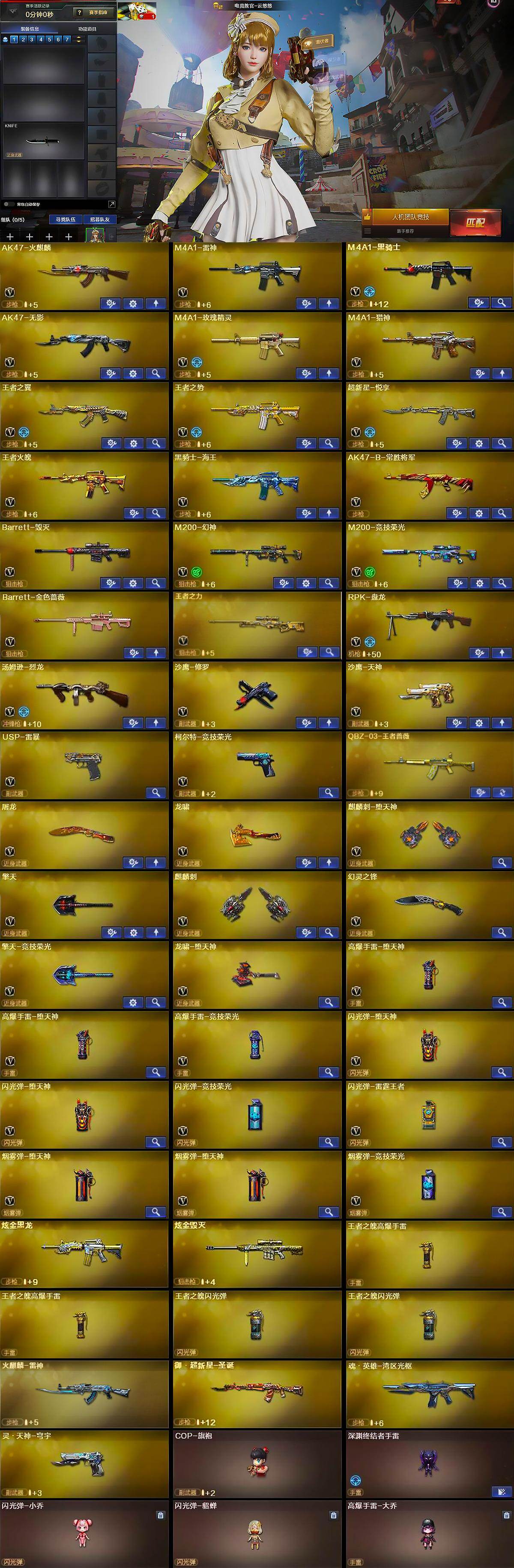 【英雄级武器】:AK47-火麒麟,M4A1-雷神,M4A1-黑骑士,AK47-无影,M4A1-玫瑰精灵,M4A1-猎神,王者之翼-觉醒版,王者之势-觉醒版,超新星-悦享-觉醒版,王者火魄-觉醒版,黑骑士-海王,AK47-B-常胜将军,Barrett-毁灭,M200-幻神,M200-竞技荣光,Barrett-金色蔷薇,王者之力-觉醒版,RPK-盘龙,汤姆逊-烈龙,沙鹰-修罗,沙鹰-天神,USP-雷暴,柯尔特-竞技荣光,屠龙,龙啸,麒麟刺-堕天神,擎天,麒麟刺,幻灵之锋,擎天-竞技荣光,龙啸-堕天神,高爆手雷-堕天神*2,高爆手雷-竞技荣光,闪光弹-堕天神*2,闪光弹-竞技荣光,闪光弹-雷霆王者-觉醒版,烟雾弹-堕天神*2,烟雾弹-竞技荣光