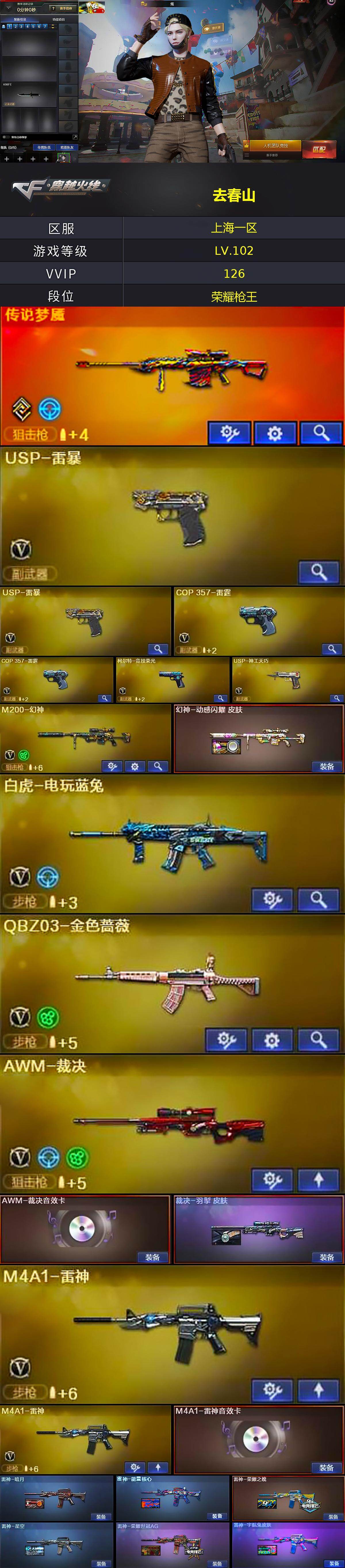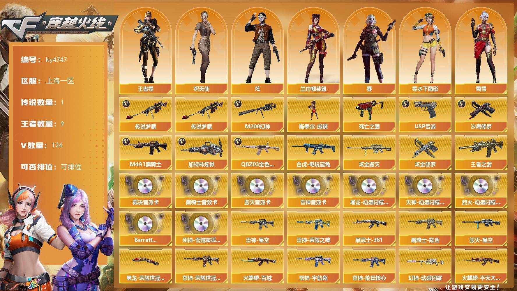 [15421739]上海一区-124V-9王者-2炫金 【传说武器】:传说梦魇 【热门武器】:传说梦魇,QBZ03-金色蔷薇,M200-幻神,死亡之眼,白虎-电玩蓝兔,M4A1-黑骑士*2,加特林-炼狱,斯泰尔-蝴蝶,USP-雷暴*2,沙鹰-修罗*4 【王者炫金武器】:王者之武,炫金毁灭,炫金修罗 【音效卡】:屠龙-动感闪耀 音效卡,天神-动感闪耀 音效卡,烈火-动感闪耀 音效卡*2,M4A1-雷神音效卡,M4A1-黑骑士音效卡,Barrett-毁灭音效卡,AWM-裁决音效卡,Barrett-碧霄极光音效卡,死神-雪域霜狐-怀旧音效卡 【皮肤】:幻神-动感闪耀 皮肤,裁决-羽掣 皮肤,雷神-暗月,雷神-能量核心,雷神-荣耀之魄,雷神-星空,雷神-荣耀世冠AG,雷神-宇航兔皮肤,火麒麟-雷神,火麒麟-平天大圣,火麒麟-百城,火麒麟-心动糖果,毁灭-星空,黑龙-能量核心*2,黑骑士耀金皮肤,AK47-黑武士-361,超新星-兔兔战士 皮肤,AK47-B-常胜将军-曹操,天龙-秘银,AWM-天龙-传奇白鲨,极光-能量核心,炼狱-末日审判 皮肤,屠龙-荣耀世冠AG 【角色】:炫,春,兰-巾帼英雄,王者-零,雪域霜狐,乔伊教练,炽天使,空,暗夜-X,初恋灵狐,芳心审判者,风暴女,嘉年华灵狐,零-水下丽影,灵狐-花神,灵狐者-黄金海岸,灵狐者-七夕宝贝,龙儿-小淘气,曼陀罗-X,曼陀罗-礼服,潘多拉-X,斯沃特-X,蜀雪,铁骑-乘风破浪,铁骑荣耀,兔囡囡,维纳斯,樱-战斗天使,影武者-X,智影 【人偶武器】:迷你钢铁终结者,迷你救赎猎手,斯泰尔-蝴蝶,海滩汪汪-巴雷特,M37-葵,迷你波特博士*2,生化手雷-机甲核心,Barrett-夜玫瑰,迷你超能女侍 【暴走生化】:死亡之眼,超级对讲机 【挑战大师】:神圣爆裂者III,冰龙粉碎者-白马银枪*2,激光毁灭者III-白马银枪,试炼破坏者III,神圣爆裂者-末日III 【英雄级武器】:AK47-火麒麟*2,M4A1-雷神*2,M4A1-黑骑士*2,M4A1-死神,AK47-黑武士,AK12-天启,AN94-超新星,M4A1-武圣,AK47-黑鲨,M4A1-龙血,M4A1-雷霆,AK47-雷暴,M4A1-神工天巧,无影-神兵利器,死神-雪域霜狐,QBZ03-金色蔷薇,烈火-动感闪耀,王者之心-觉醒版,王者之幻-觉醒版,超新星-悦享-觉醒版,AK-47