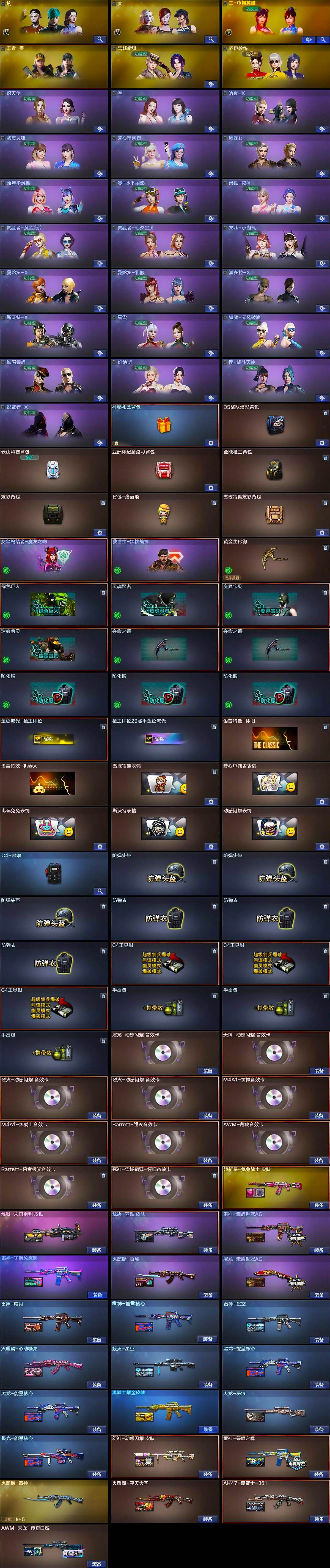 【英雄级武器】:AK47-火麒麟*2,M4A1-雷神*2,M4A1-黑骑士*2,M4A1-死神,AK47-黑武士,AK12-天启,AN94-超新星,M4A1-武圣,AK47-黑鲨,M4A1-龙血,M4A1-雷霆,AK47-雷暴,M4A1-神工天巧,无影-神兵利器,死神-雪域霜狐,QBZ03-金色蔷薇,烈火-动感闪耀,王者之心-觉醒版,王者之幻-觉醒版,超新星-悦享-觉醒版,AK-47
