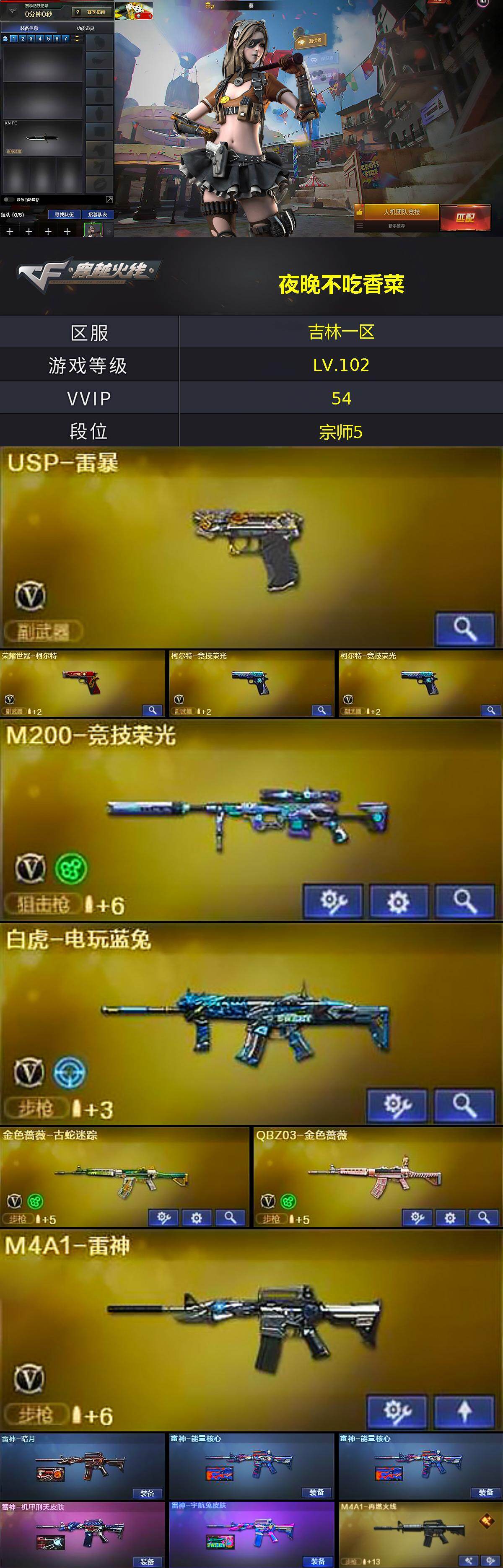 [15422079]吉林一区-51V-0王者-0炫金 【热门武器】:QBZ03-金色蔷薇,金色蔷薇-古蛇迷踪,修罗-古蛇迷踪,M200-竞技荣光,白虎-电玩蓝兔,荣耀世冠-柯尔特,M4A1-黑骑士,USP-雷暴,沙鹰-修罗*2 【音效卡】:M4A1-黑骑士音效卡,Barrett-碧霄极光音效卡,炼狱-百战金芒-庆典舞曲音效卡 【皮肤】:雷神-暗月,雷神-能量核心*2,雷神-机甲刑天皮肤,雷神-宇航兔皮肤,M4A1-再燃火线,火麒麟-AG战队皮肤,火麒麟-百城,毁灭-暗月*2,M4A1-千变-孔明皮肤,天启-暗月,战神-粉色甜心皮肤,战神-紫绶金章皮肤*2,极光-能量核心*2,修罗-能量核心*2,屠龙-荣耀世冠AG,轻型军用手斧-再燃火线 【角色】:葵,电竞教官-云悠悠,蛇隐宗,乔伊教练,修道士,暗夜-X,芳心审判者,风暴女,虎妞,灵狐者-X,灵狐者-七夕宝贝,龙儿-小淘气,潘多拉-甜心教官,青霞仙子,蛇姬,铁骑荣耀,兔囡囡 【人偶武器】:迷你深渊冰龙,迷你裂空之翼*3,迷你牛魔王,迷你波特博士*4,迷你曼提柯尔,夺魂*11,迷你火种,生化手雷-机甲核心,深渊终结者手雷,迷你艾比,迷你超能女侍 【暴走生化】:超级对讲机 【挑战大师】:神圣爆裂者III,冰龙粉碎者-白马银枪*2,激光毁灭者III-白马银枪*2,VEPR-12-金魔,机甲撕裂者III,试炼破坏者III,KAC-圣炎切割者III,惩戒者III 【英雄级武器】:M4A1-千变,AK47-火麒麟*2,M4A1-雷神,M4A1-黑骑士,AK12-天启,金色蔷薇-古蛇迷踪,M4A1-玫瑰精灵,QBZ03-金色蔷薇,AK-47-猩红传说*2,AK47-B-战神,白虎-电玩蓝兔,Barrett-毁灭,Barrett-极光,M200-竞技荣光,炼狱-百战金芒,沙鹰-修罗*2,沙鹰-天神*2,USP-雷暴,荣耀世冠-柯尔特,柯尔特-竞技荣光*2,修罗-古蛇迷踪,屠龙,龙啸,擎天*3,擎天-竞技荣光,麒麟刺-百战金芒,高爆手雷-竞技荣光*4,高爆手雷-古蛇迷踪,闪光弹-竞技荣光*4,烟雾弹-竞技荣光*4,烟雾弹-古蛇迷踪,M4A1-苍鸣雷神,Barrett-碧霄极光 【道具】:BS战队炫彩背包,CFS限定背包,云山科技背包,亚洲杯纪念炫彩背包,古蛇迷踪炫彩背包,战舰背包,炫彩背包,百战金芒炫彩背包,虎牙炫彩背包,超级背包,黄金曼提柯尔的背包,